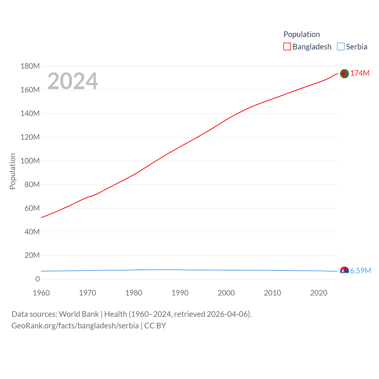 Bangladesh has a population of 174M (ranked 8/197), compared with 6.59M in Serbia (ranked 109/197). Bangladesh's land area is 50,186 sq mi versus 32,467 sq mi for Serbia (ranked 94th vs. 111th).