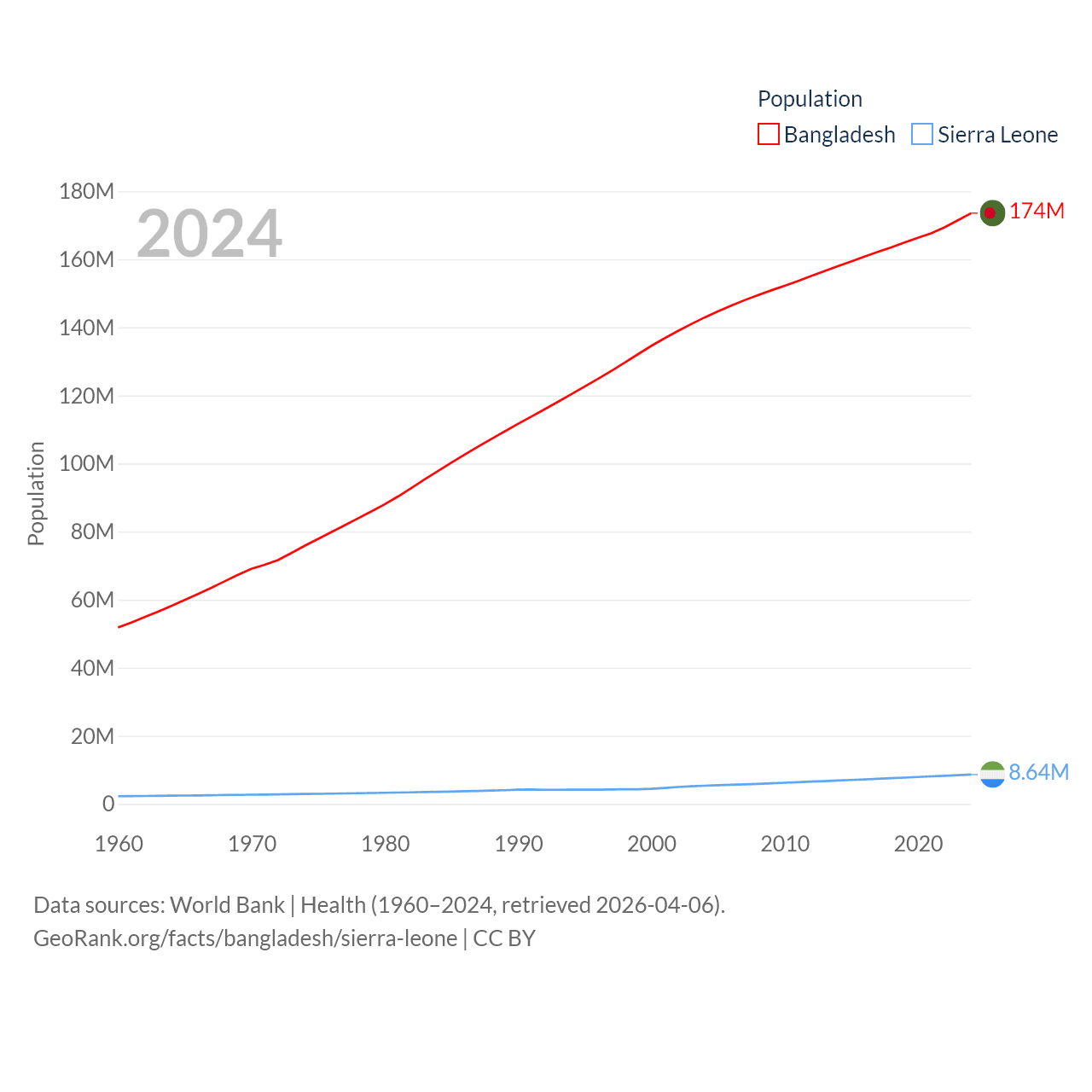 Bangladesh has a population of 174M (ranked 8/197), compared with 8.64M in Sierra Leone (ranked 102/197). Bangladesh's land area is 50,186 sq mi versus 27,869 sq mi for Sierra Leone (ranked 94th vs. 116th).