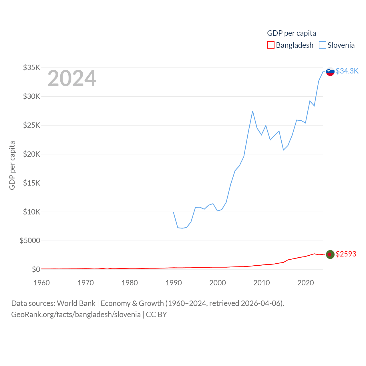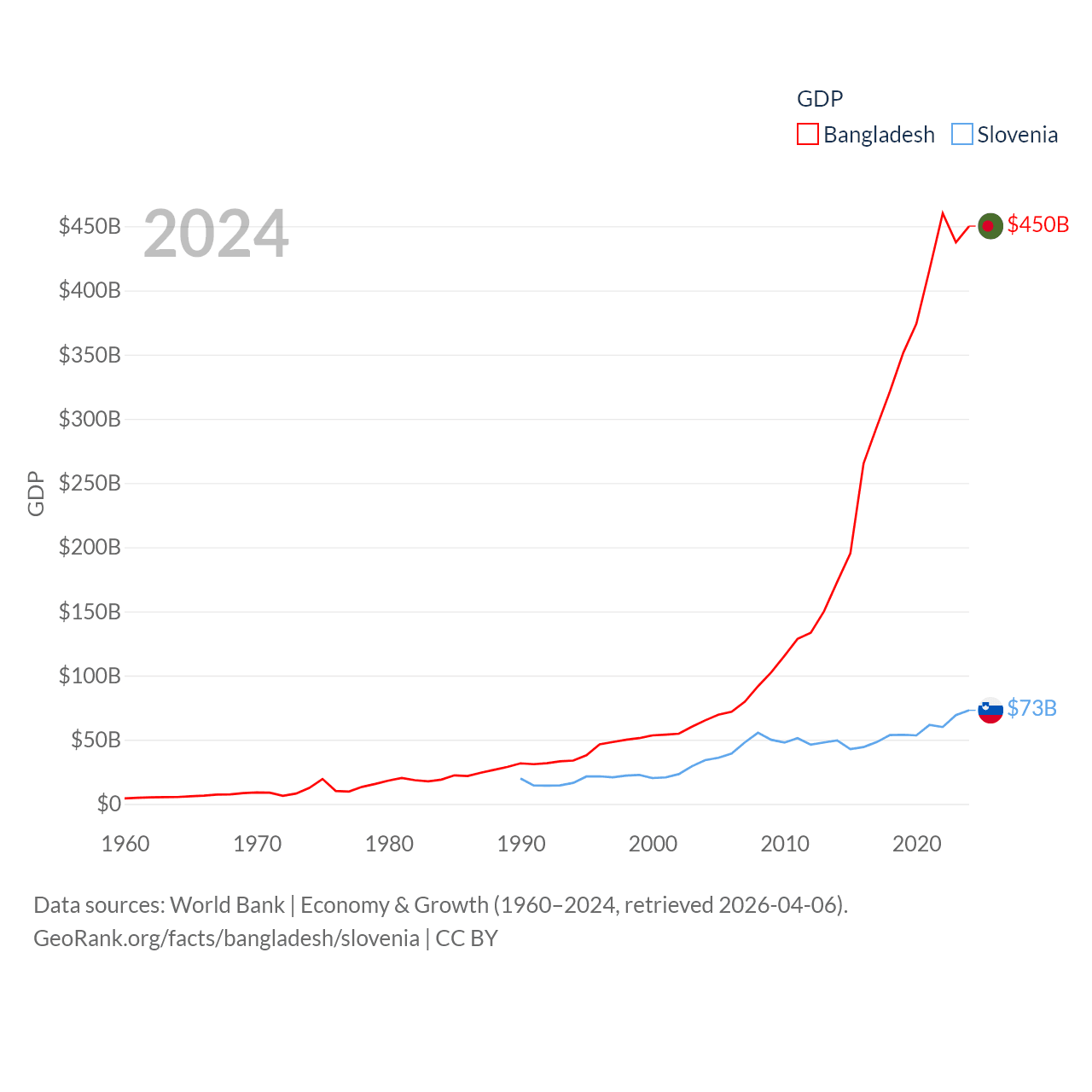 By GDP, Bangladesh ranks 36/197 ($450B) and Slovenia ranks 86/197 ($73B). By GDP per capita, Bangladesh ranks 146/197 ($2,593), while Slovenia ranks 34/197 ($34,301).