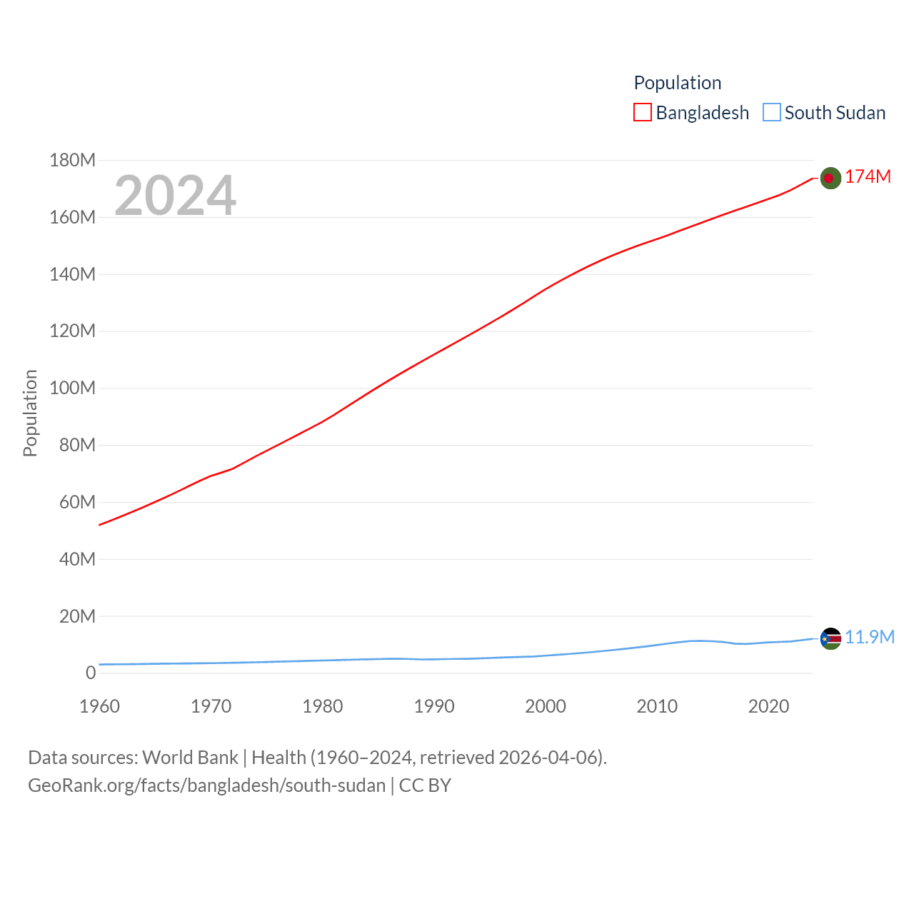 Bangladesh has a population of 174M (ranked 8/197), compared with 11.9M in South Sudan (ranked 81/197). Bangladesh's land area is 50,186 sq mi versus 243,990 sq mi for South Sudan (ranked 94th vs. 41st).