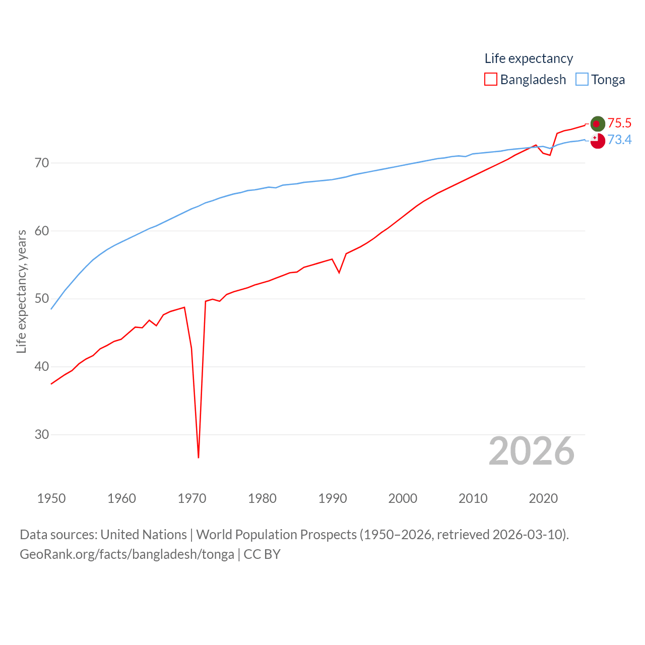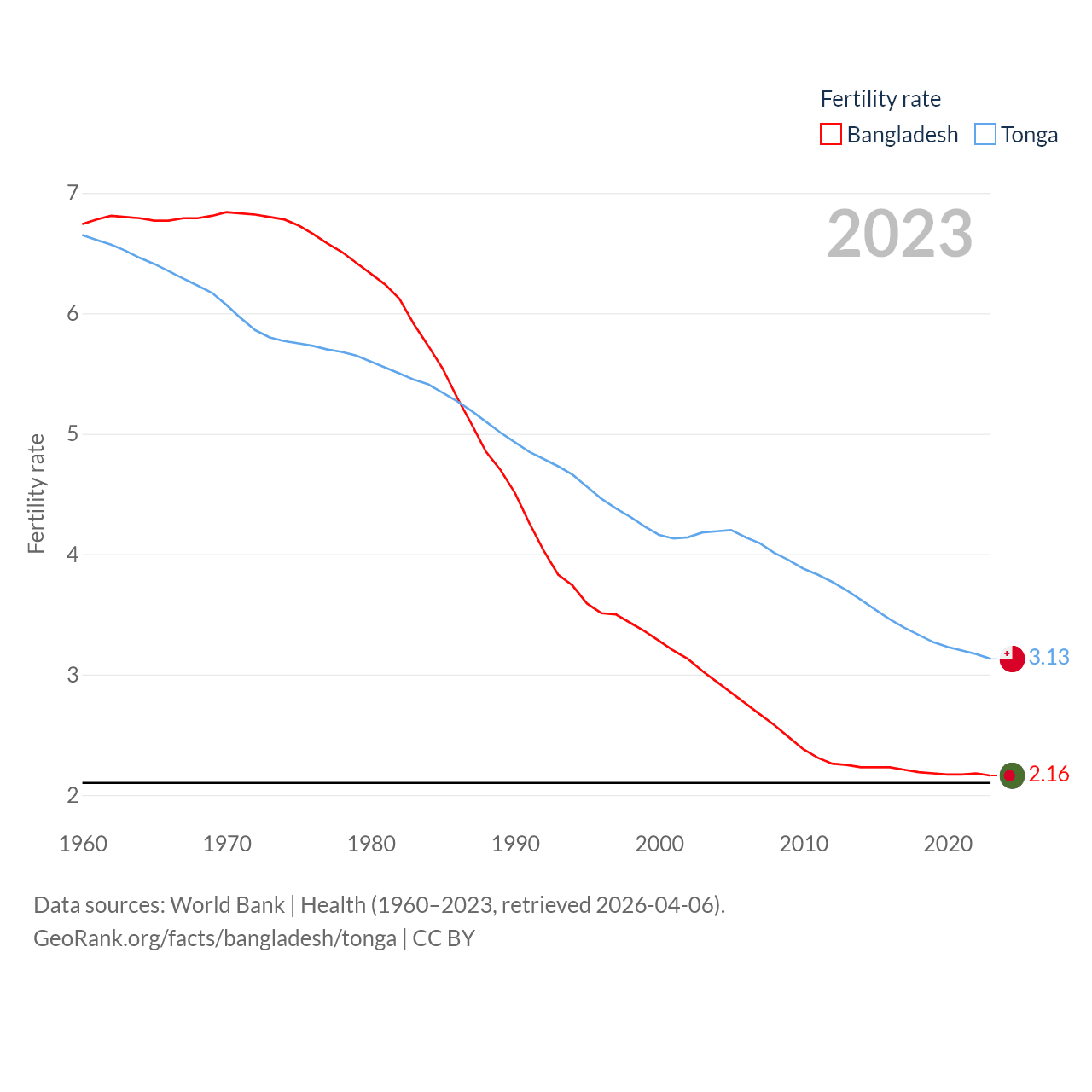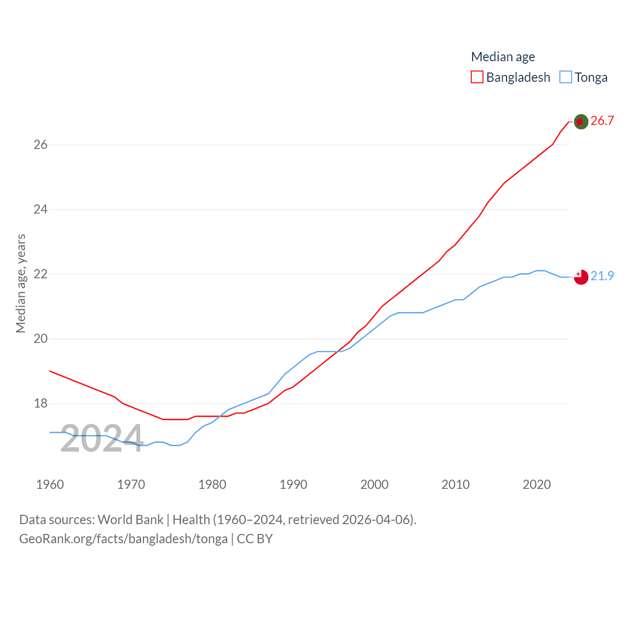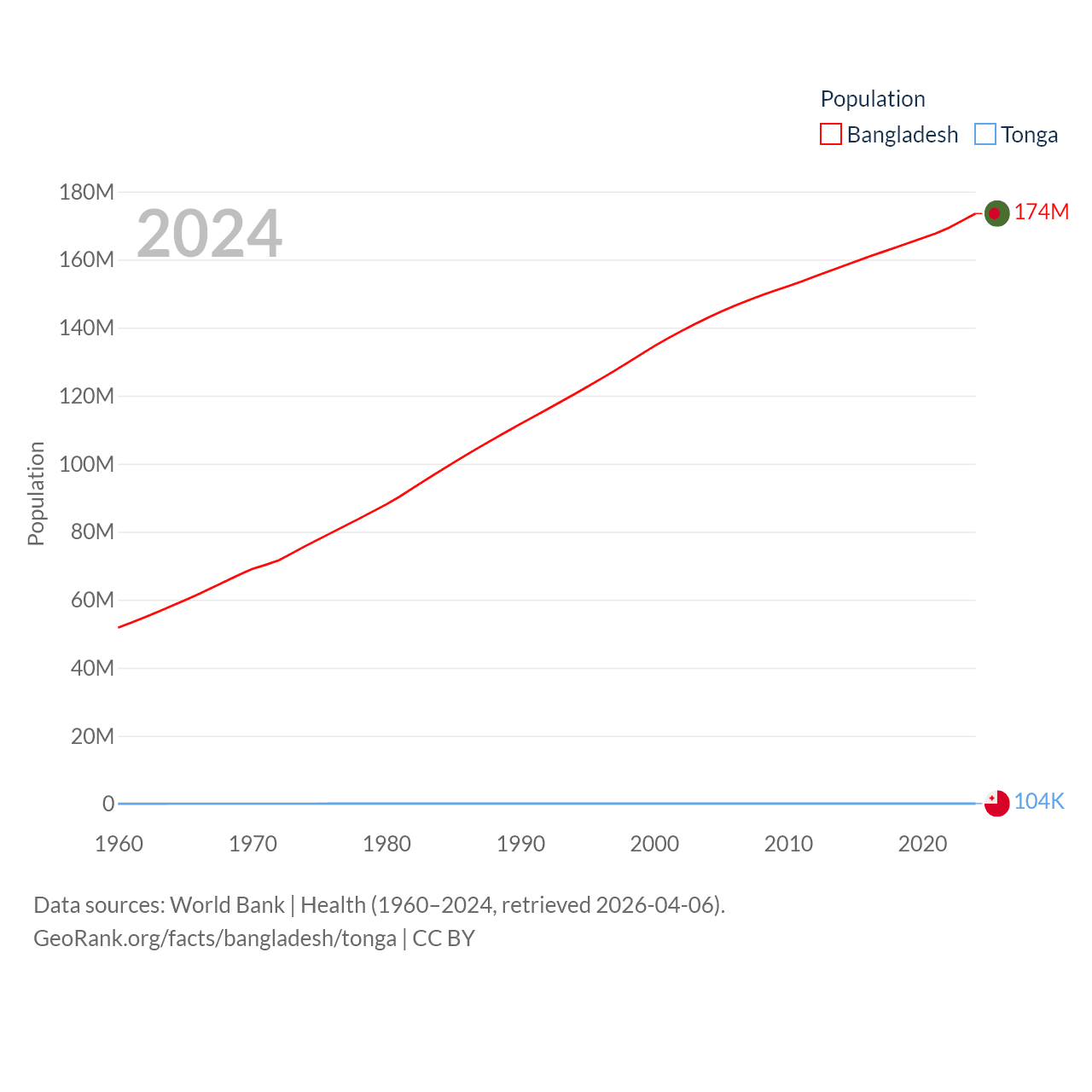 Bangladesh has a population of 174M (ranked 8/197), compared with 104K in Tonga (ranked 183/197). Bangladesh's land area is 50,186 sq mi versus 278 sq mi for Tonga (ranked 94th vs. 176th).