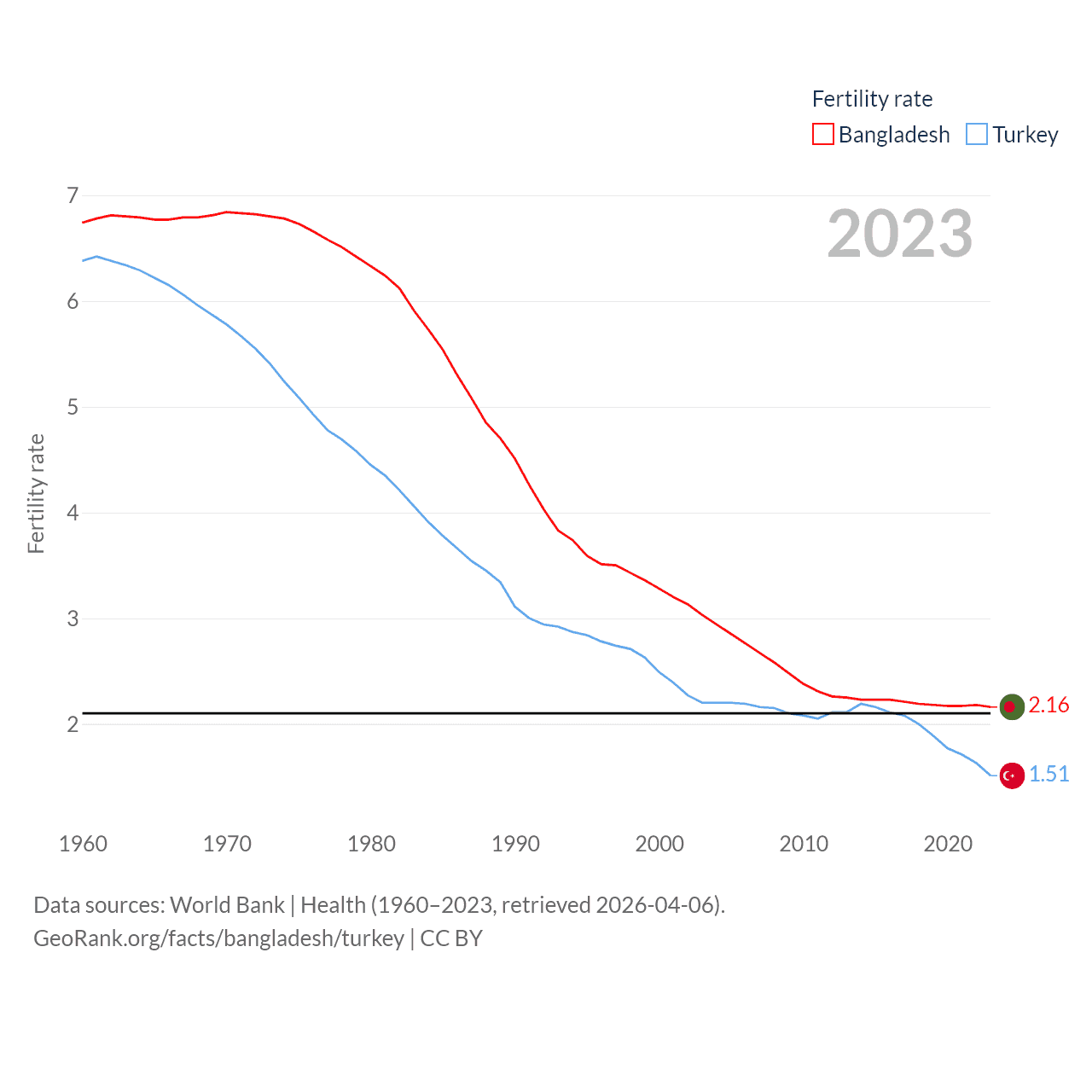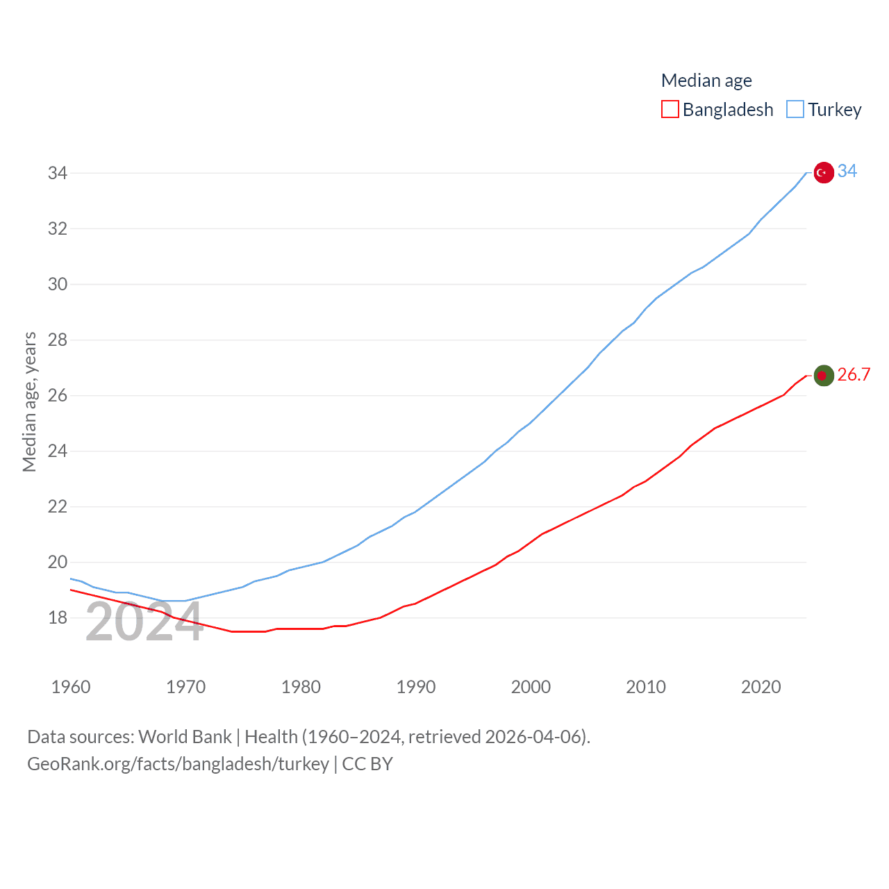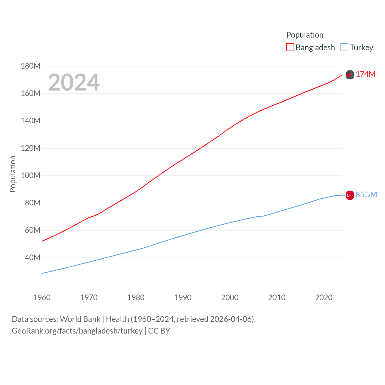 Bangladesh has a population of 174M (ranked 8/197), compared with 85.5M in Turkey (ranked 18/197). Bangladesh's land area is 50,186 sq mi versus 297,156 sq mi for Turkey (ranked 94th vs. 36th).