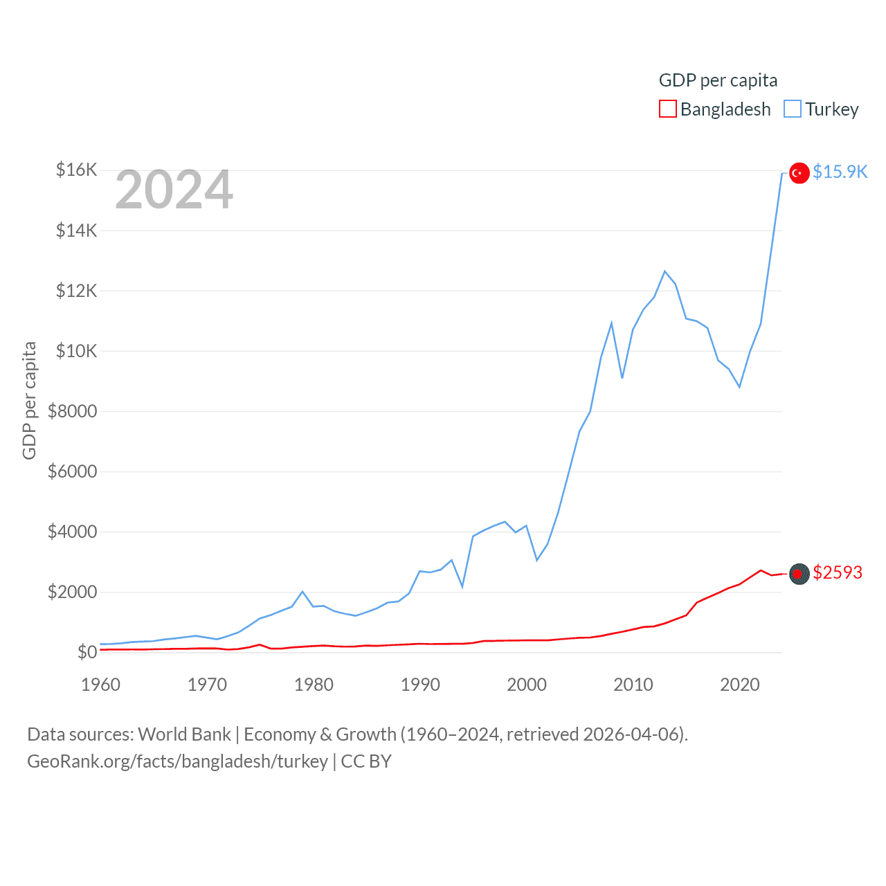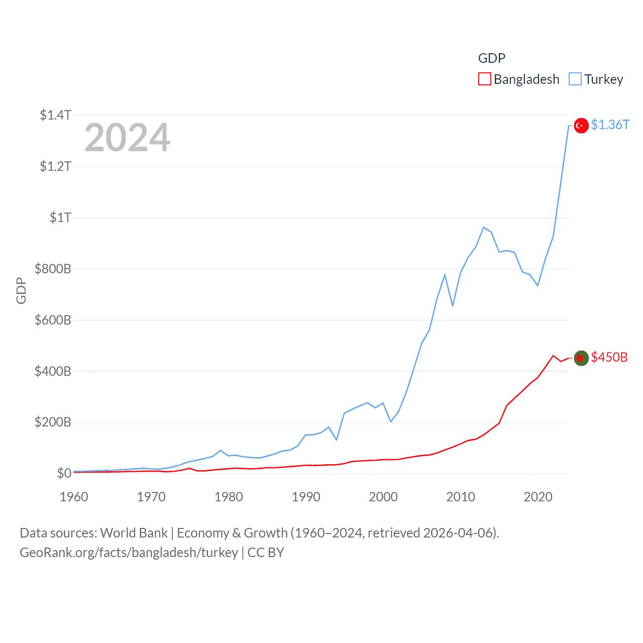 By GDP, Bangladesh ranks 36/197 ($450B) and Turkey ranks 17/197 ($1.36T). By GDP per capita, Bangladesh ranks 146/197 ($2,593), while Turkey ranks 66/197 ($15,893).