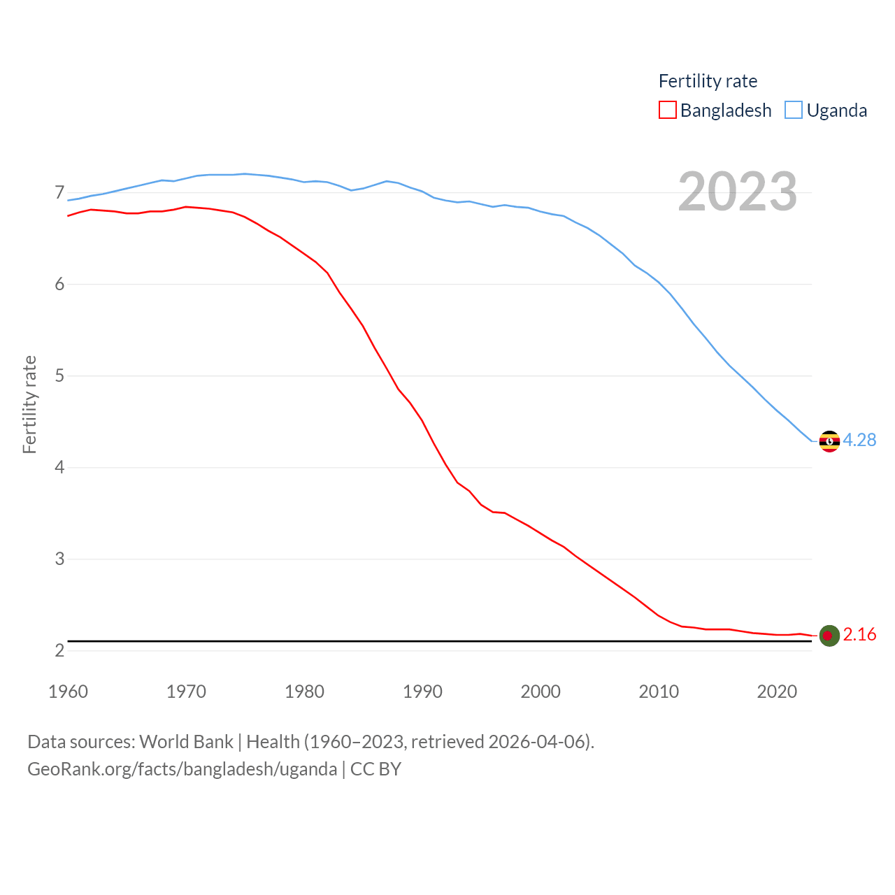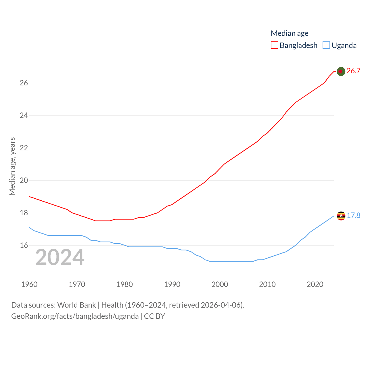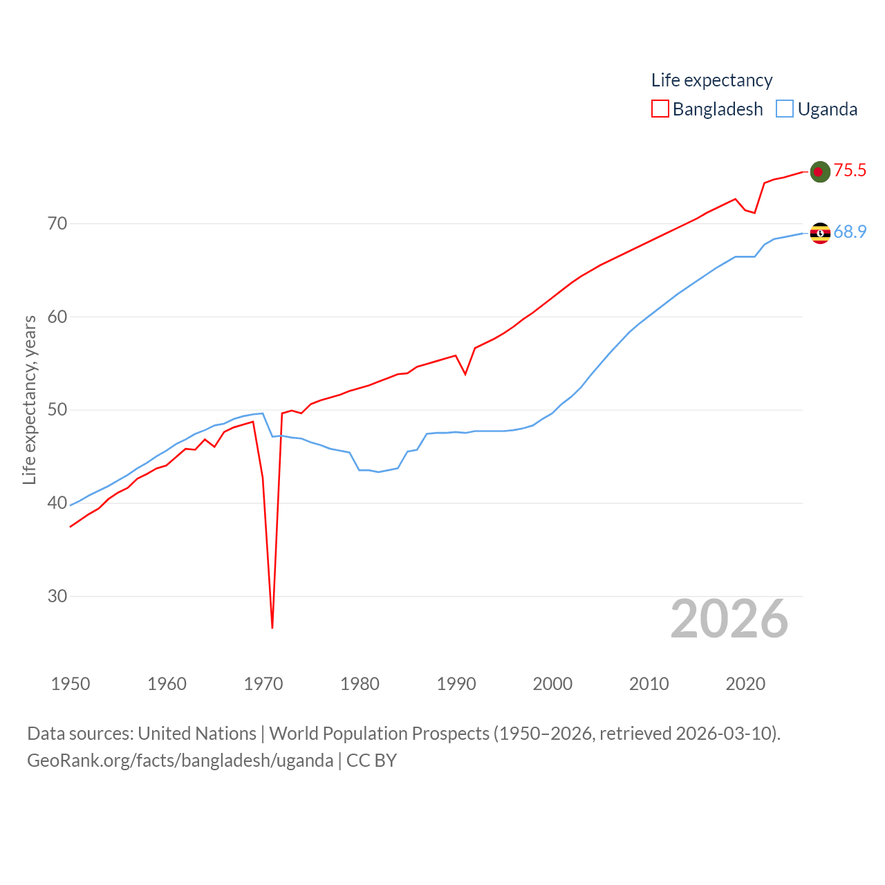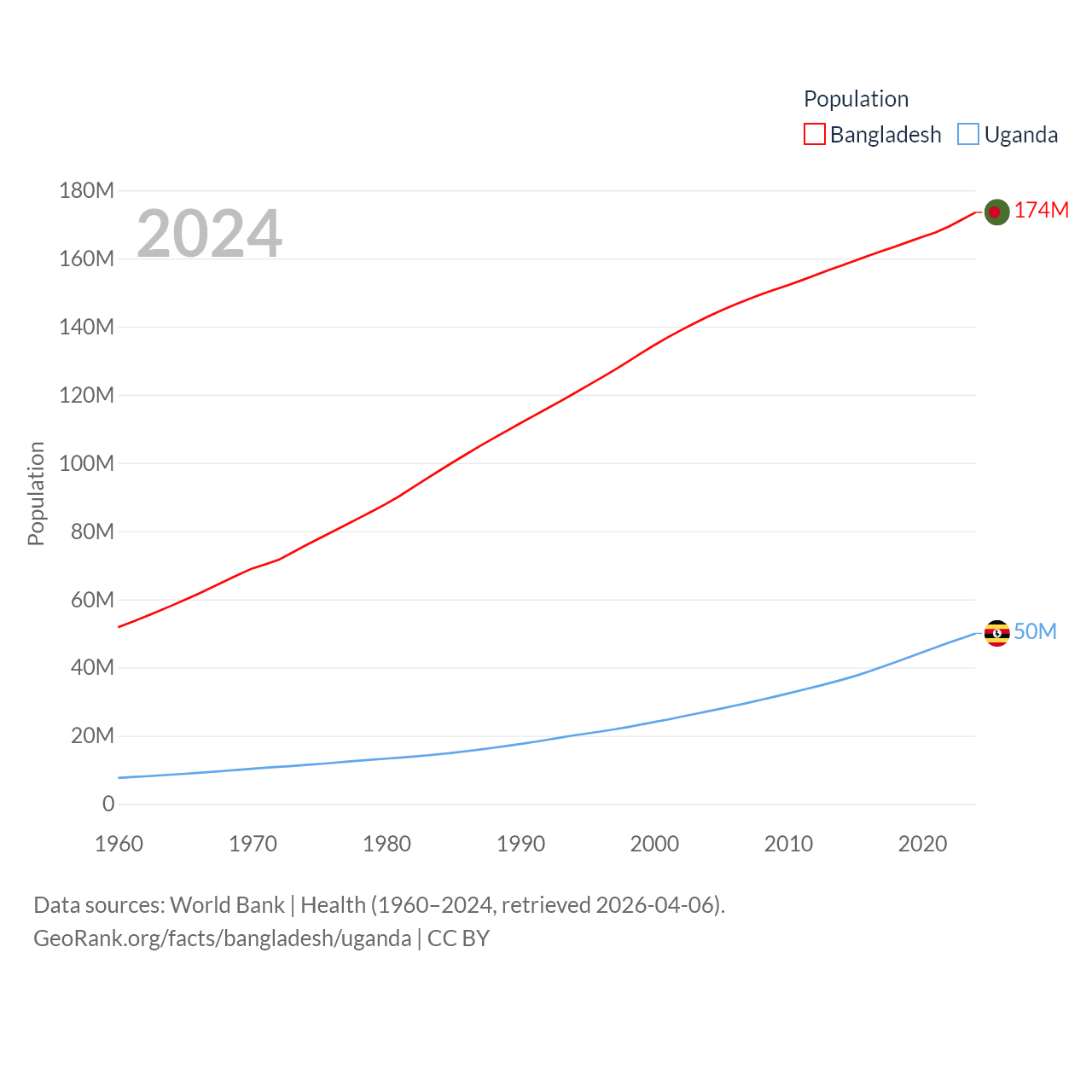 Bangladesh has a population of 174M (ranked 8/197), compared with 50M in Uganda (ranked 31/197). Bangladesh's land area is 50,186 sq mi versus 77,421 sq mi for Uganda (ranked 94th vs. 84th).