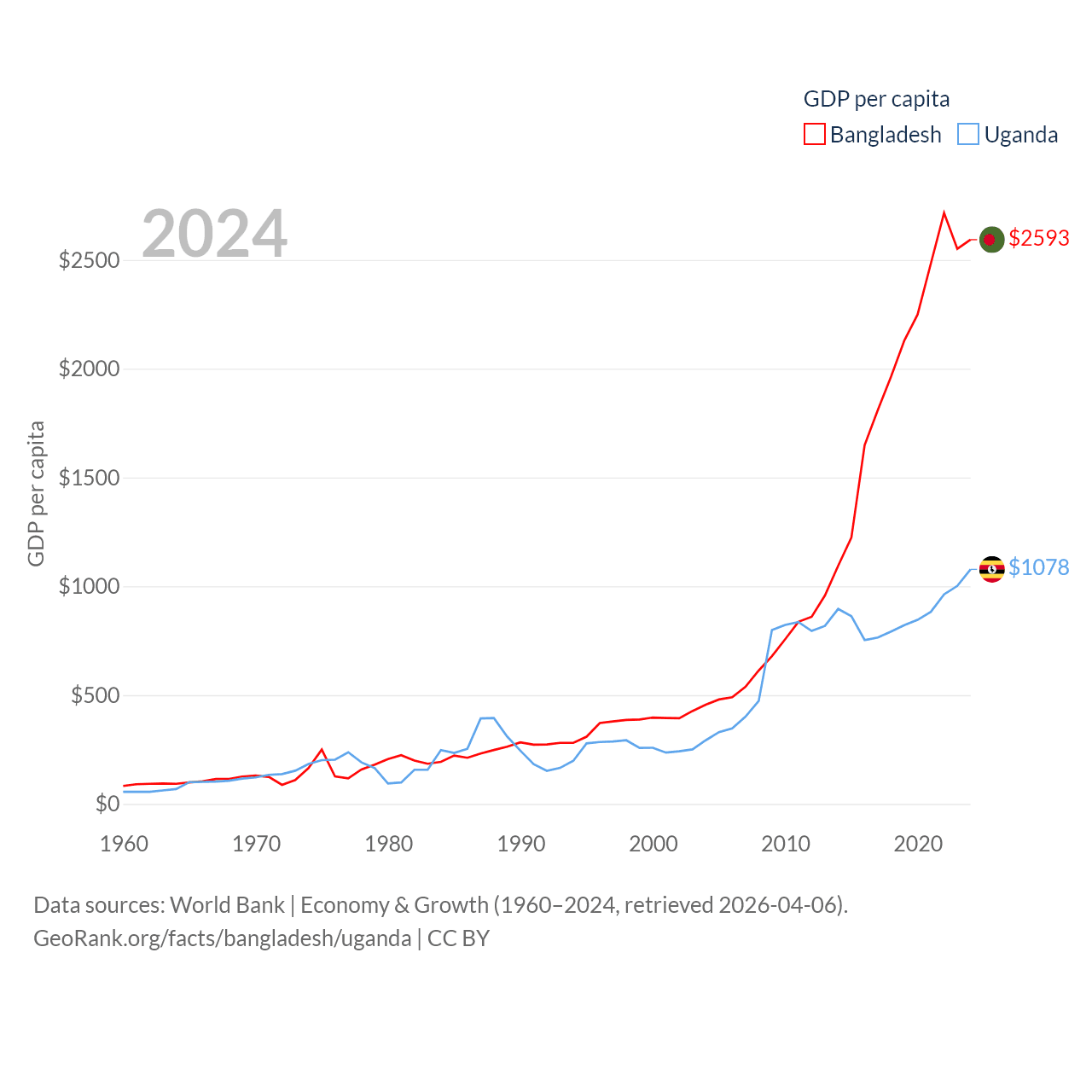 By GDP, Bangladesh ranks 36/197 ($450B) and Uganda ranks 89/197 ($53.9B). By GDP per capita, Bangladesh ranks 146/197 ($2,593), while Uganda ranks 176/197 ($1,078).