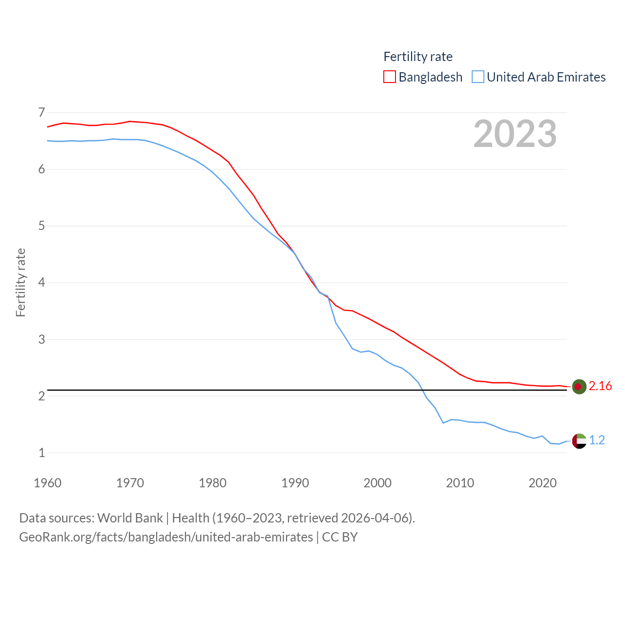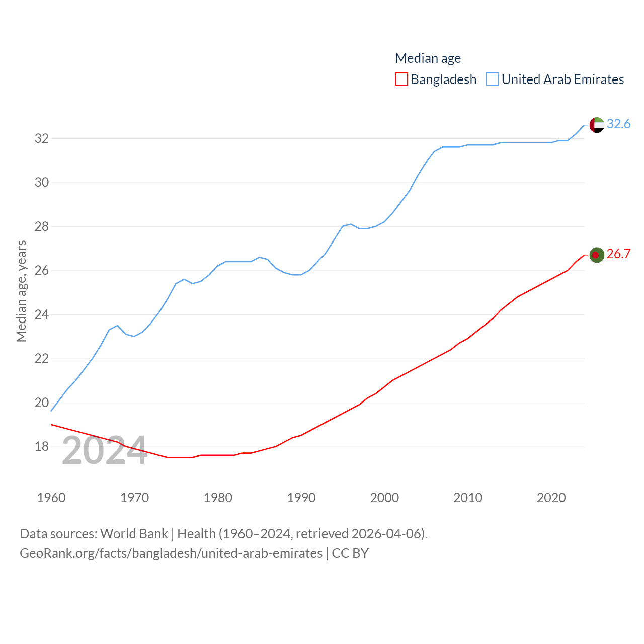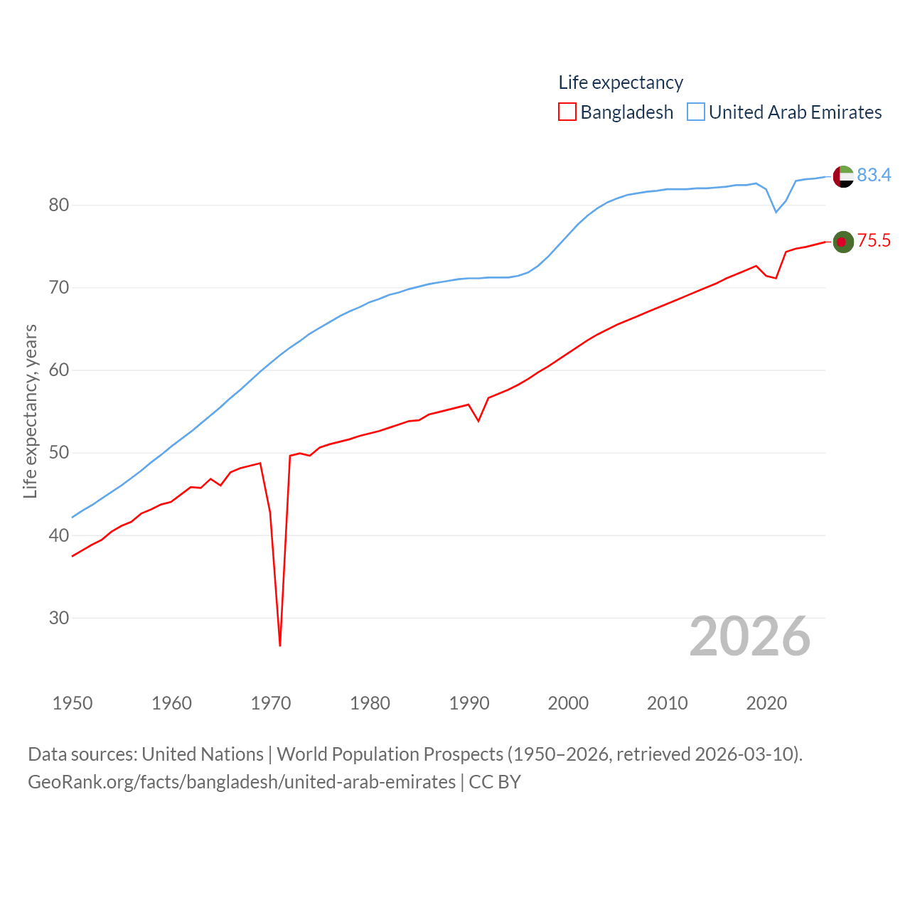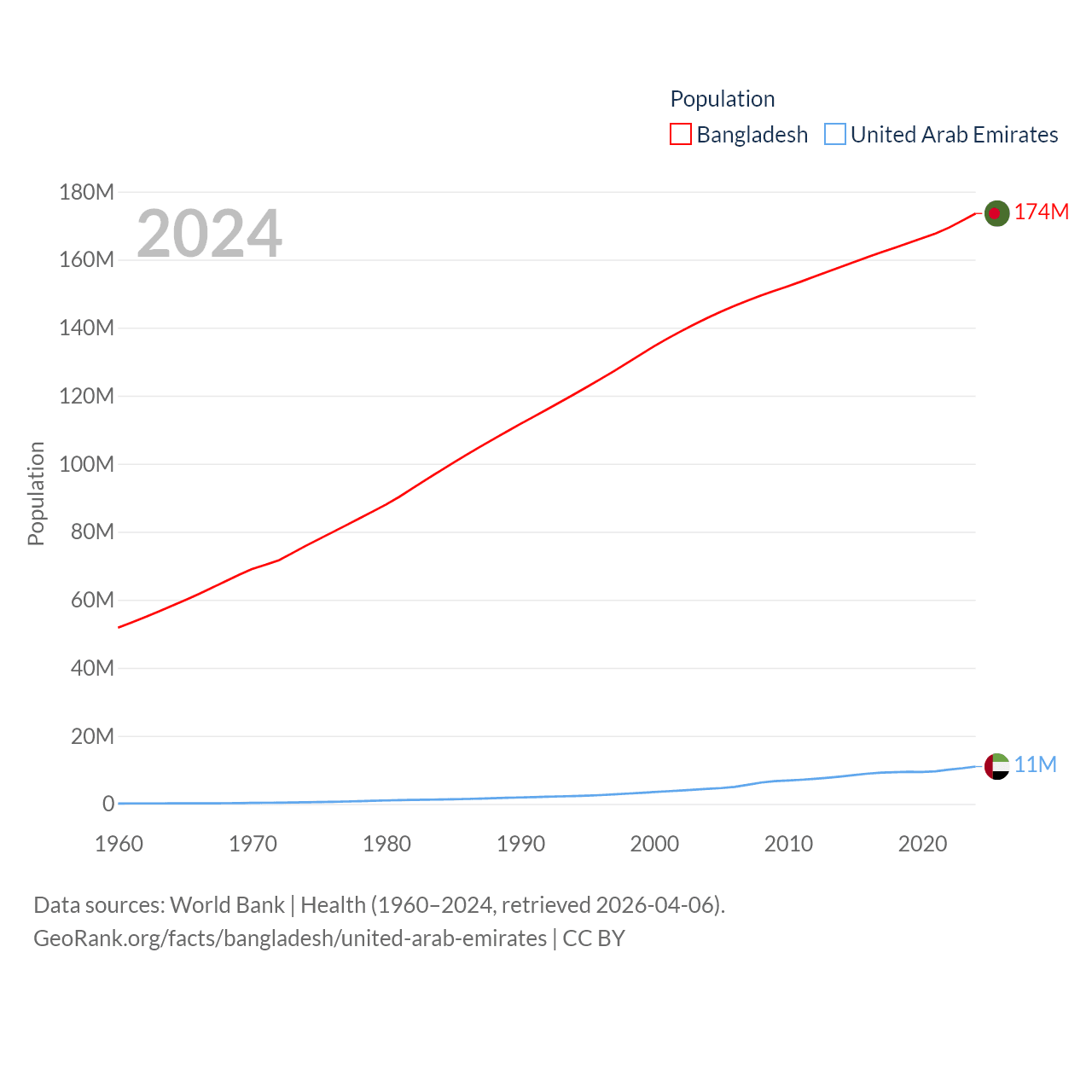 Bangladesh has a population of 174M (ranked 8/197), compared with 11M in The United Arab Emirates (ranked 86/197). Bangladesh's land area is 50,186 sq mi versus 27,421 sq mi for The United Arab Emirates (ranked 94th vs. 117th).