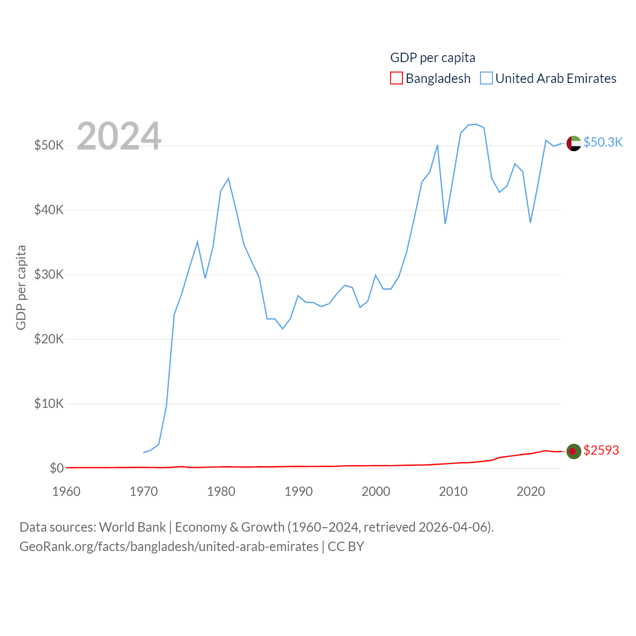 By GDP, Bangladesh ranks 36/197 ($450B) and The United Arab Emirates ranks 27/197 ($552B). By GDP per capita, Bangladesh ranks 146/197 ($2,593), while The United Arab Emirates ranks 24/197 ($50,274).