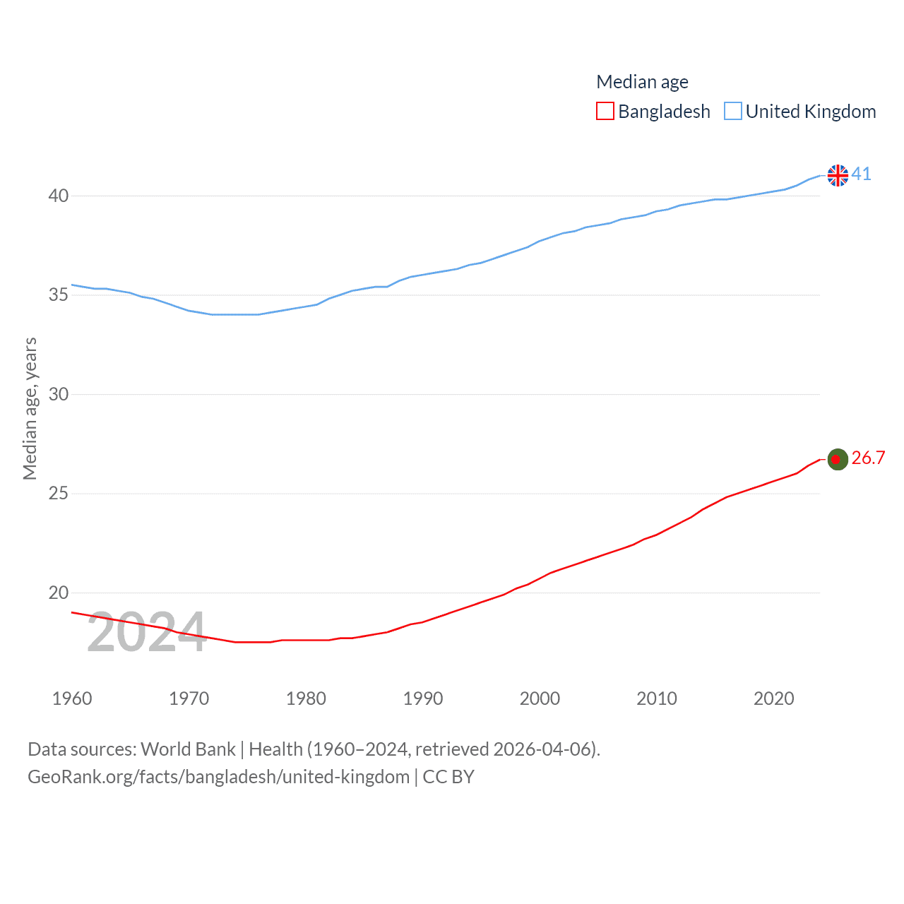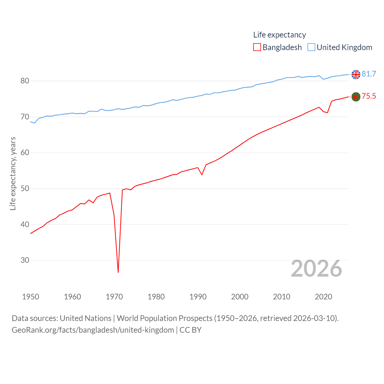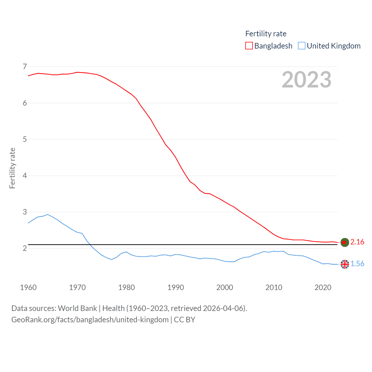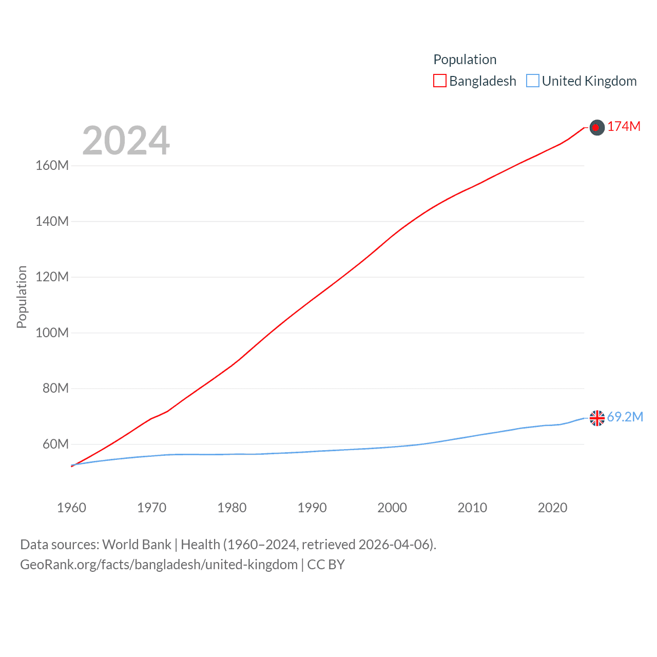 Bangladesh has a population of 174M (ranked 8/197), compared with 69.2M in The United Kingdom (ranked 21/197). Bangladesh's land area is 50,186 sq mi versus 93,410 sq mi for The United Kingdom (ranked 94th vs. 78th).