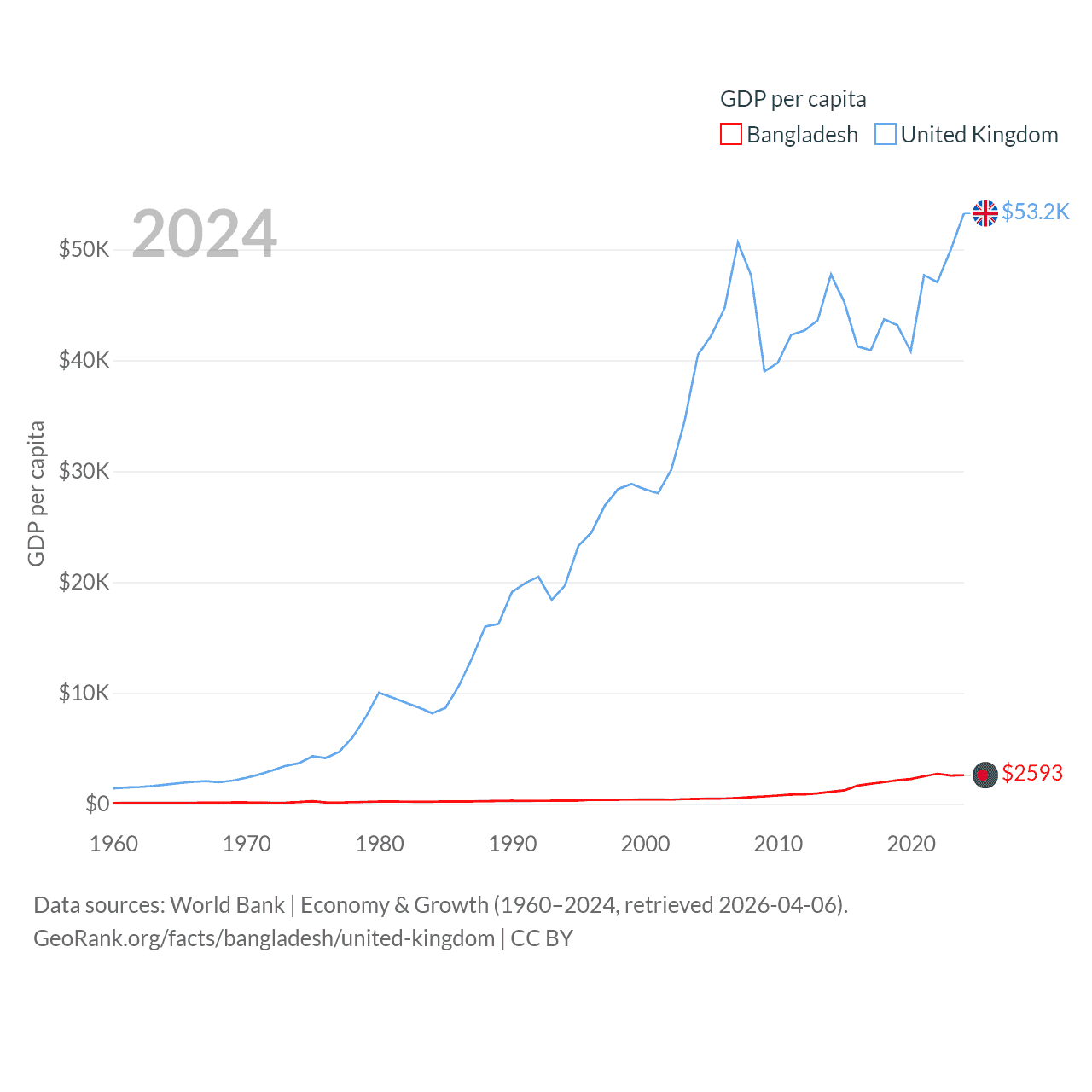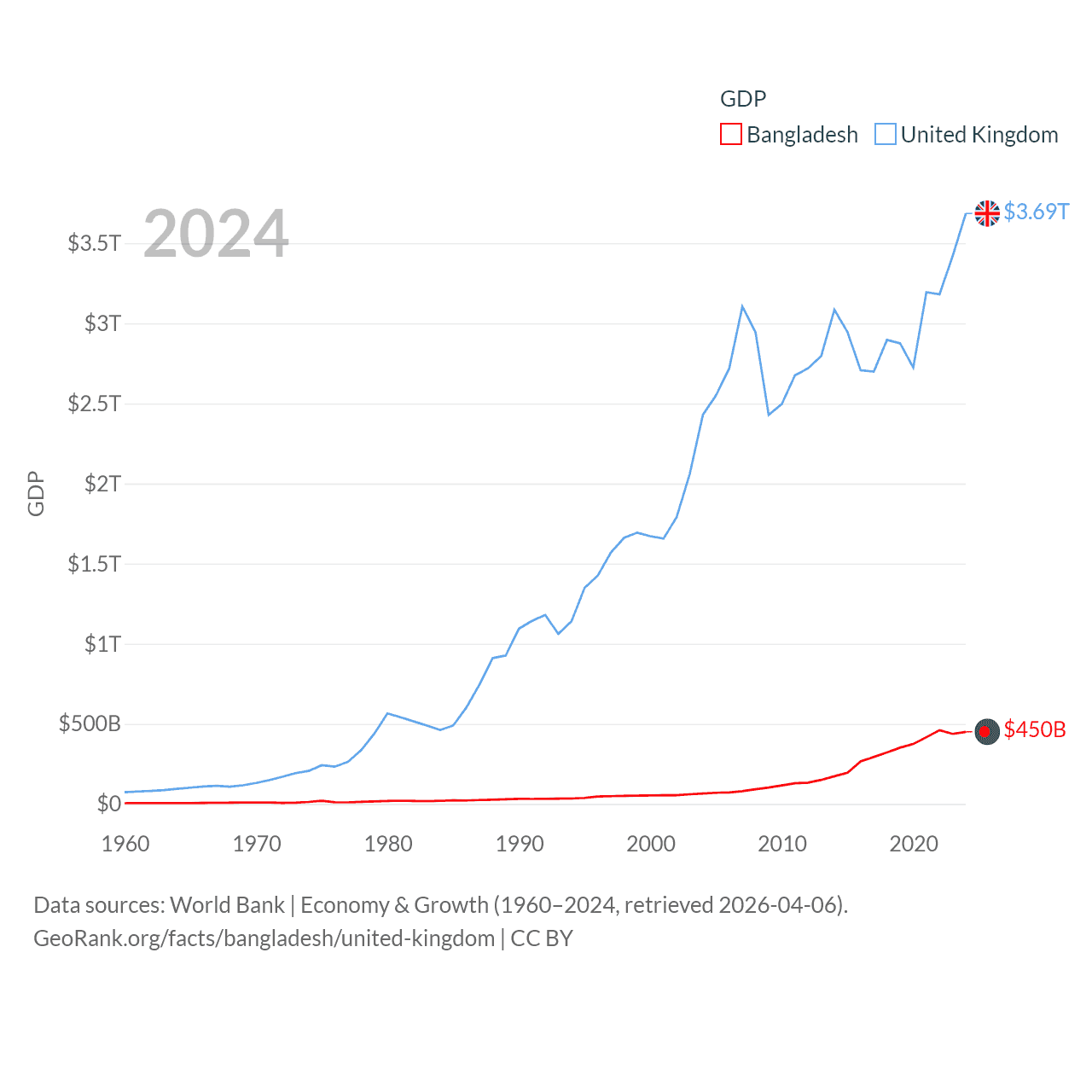 By GDP, Bangladesh ranks 36/197 ($450B) and The United Kingdom ranks 6/197 ($3.69T). By GDP per capita, Bangladesh ranks 146/197 ($2,593), while The United Kingdom ranks 22/197 ($53,246).