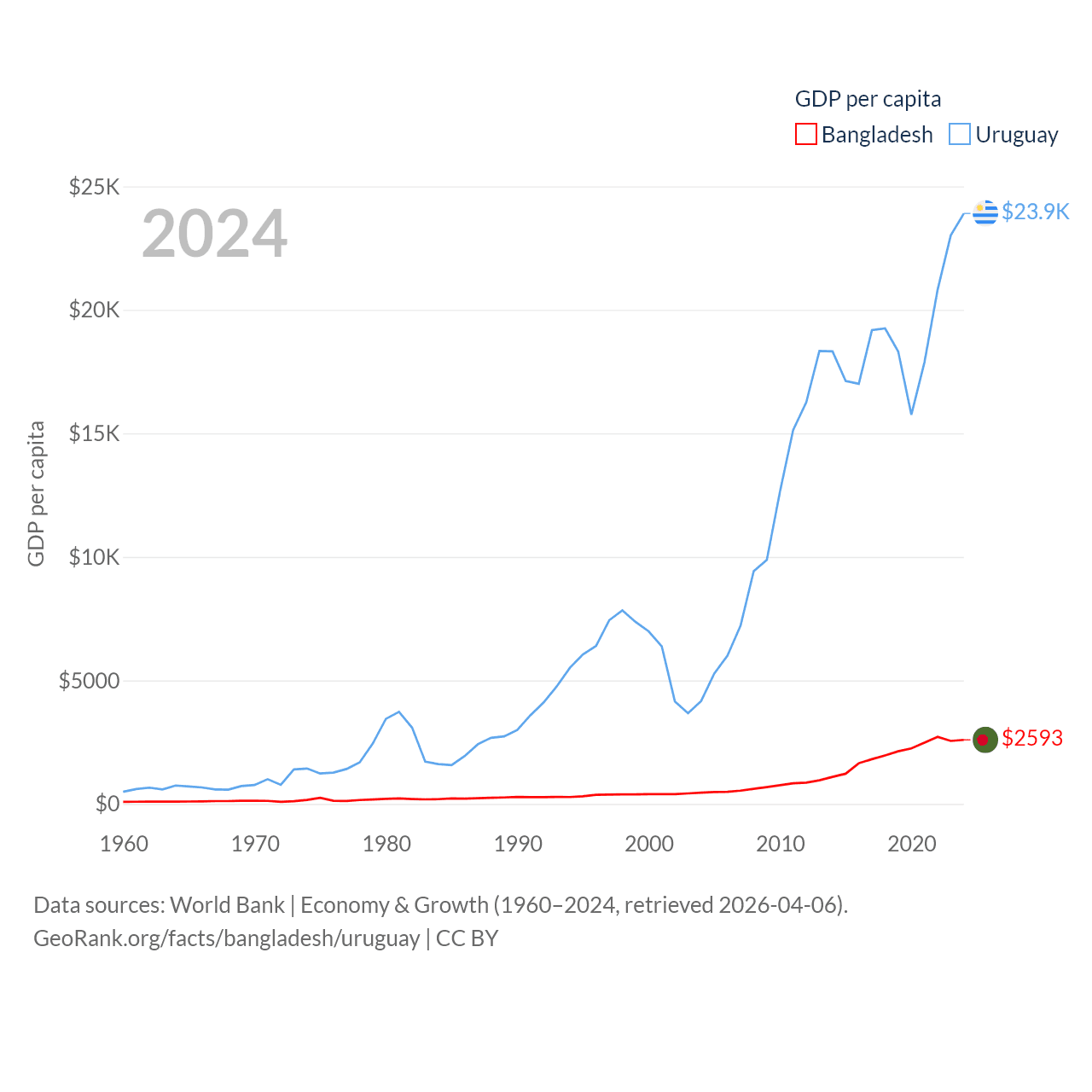 By GDP, Bangladesh ranks 36/197 ($450B) and Uruguay ranks 81/197 ($81B). By GDP per capita, Bangladesh ranks 146/197 ($2,593), while Uruguay ranks 52/197 ($23,907).