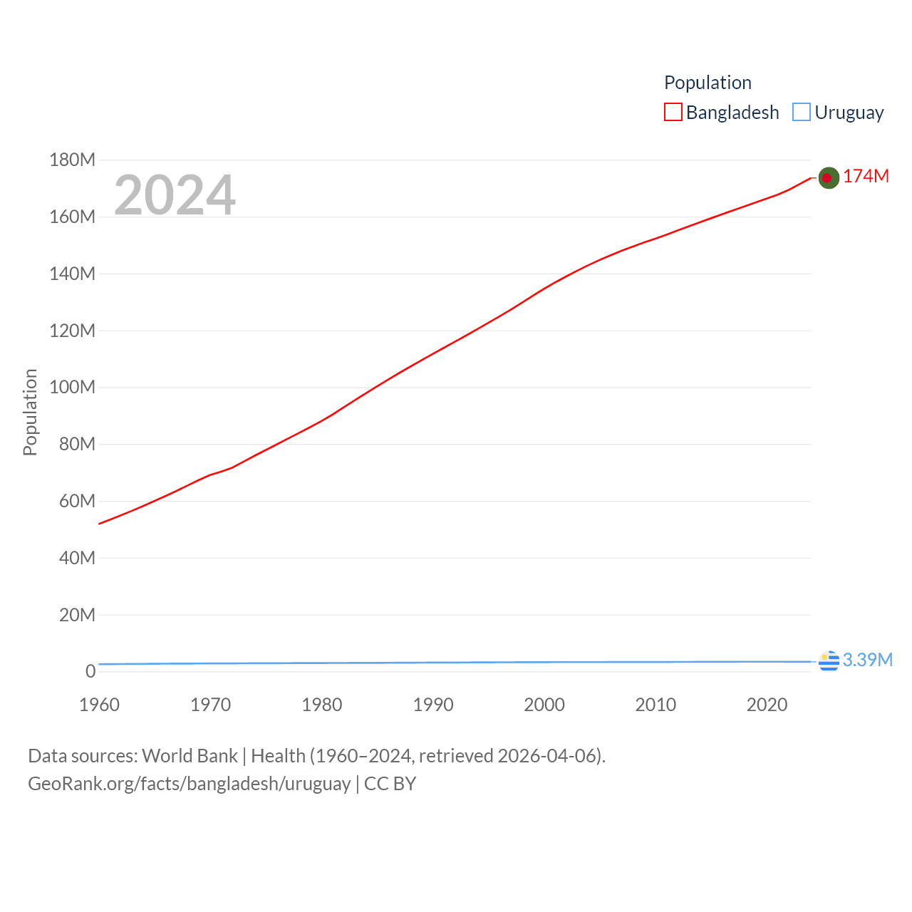 Bangladesh has a population of 174M (ranked 8/197), compared with 3.39M in Uruguay (ranked 133/197). Bangladesh's land area is 50,186 sq mi versus 67,576 sq mi for Uruguay (ranked 94th vs. 89th).