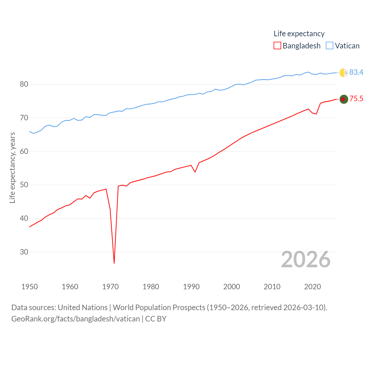 Bangladesh vs. Vatican life expectancy calculator