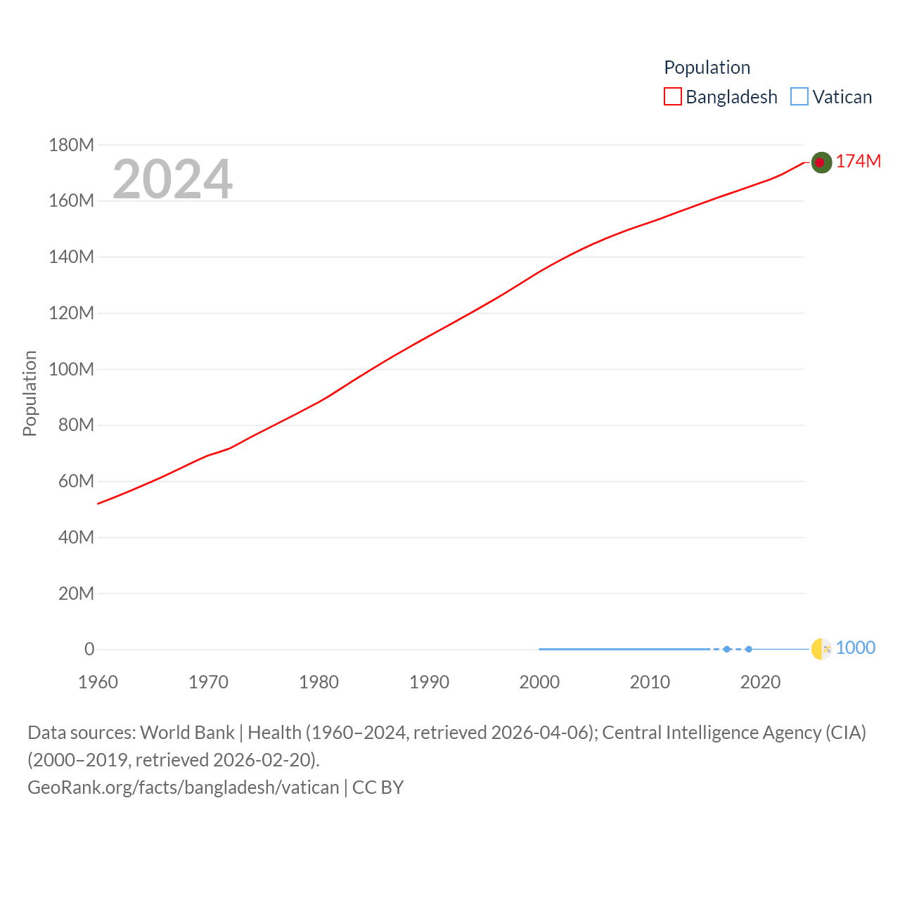 Bangladesh has a population of 174M (ranked 8/197), compared with 1K in The Vatican (ranked 197/197). Bangladesh's land area is 50,186 sq mi versus 0.17 sq mi for The Vatican (ranked 94th vs. 197th).