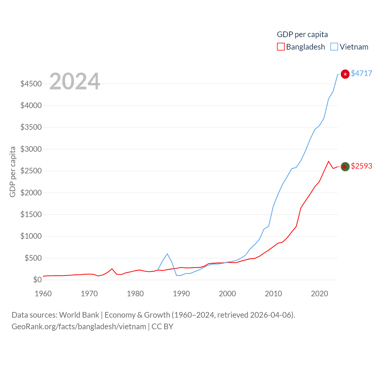 By GDP, Bangladesh ranks 36/197 ($450B) and Vietnam ranks 33/197 ($476B). By GDP per capita, Bangladesh ranks 146/197 ($2,593), while Vietnam ranks 122/197 ($4,717).