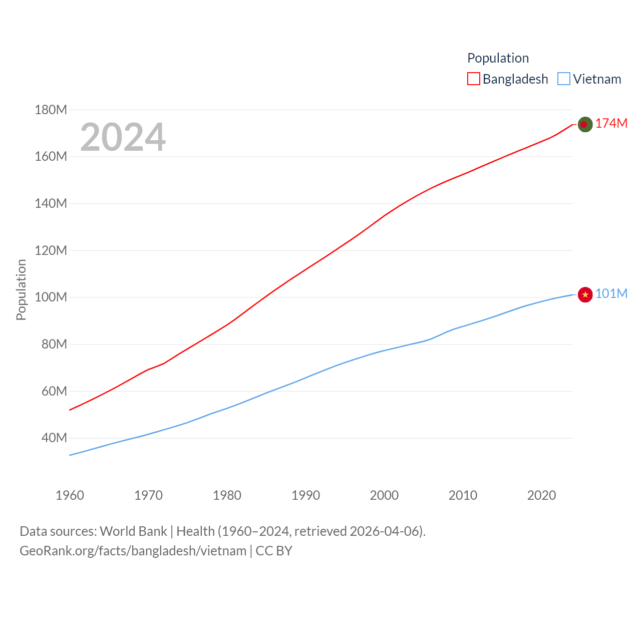Bangladesh has a population of 174M (ranked 8/197), compared with 101M in Vietnam (ranked 16/197). Bangladesh's land area is 50,186 sq mi versus 121,016 sq mi for Vietnam (ranked 94th vs. 67th).