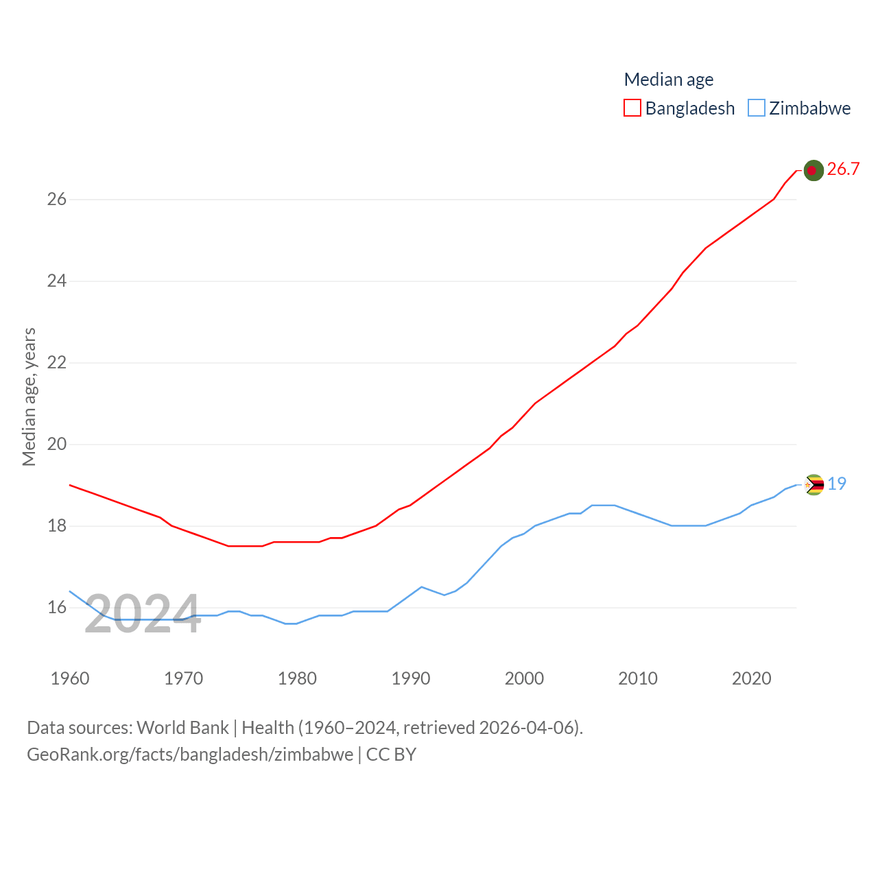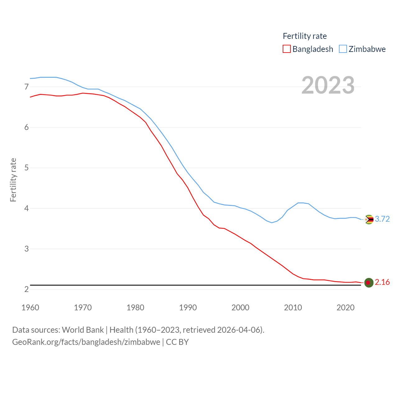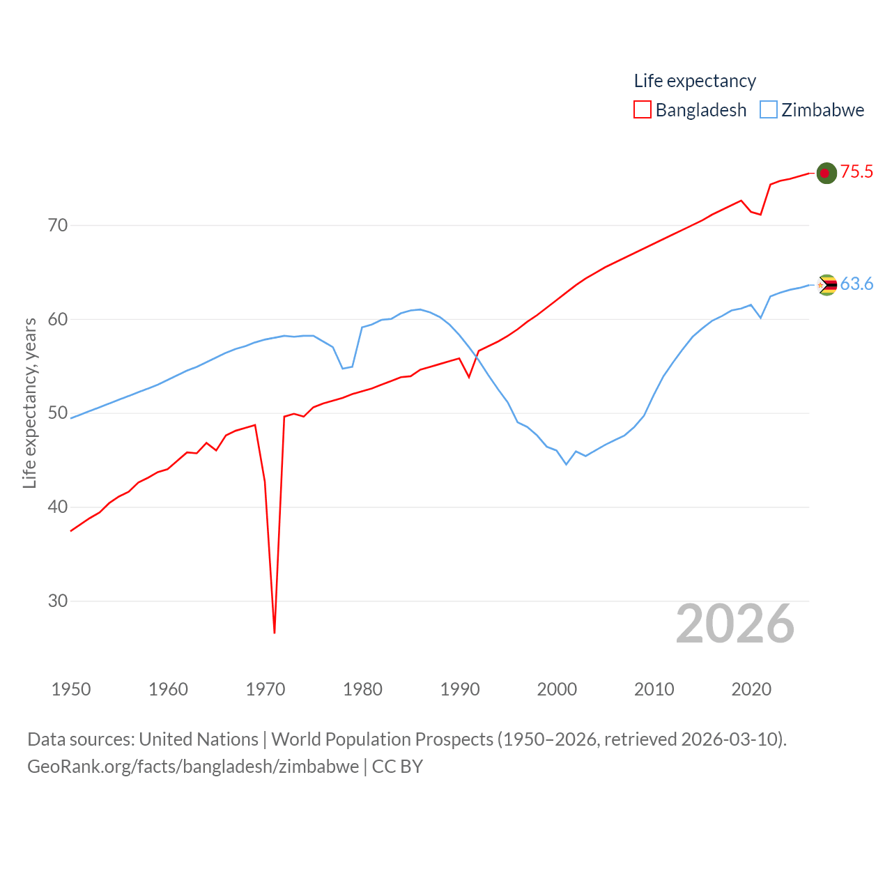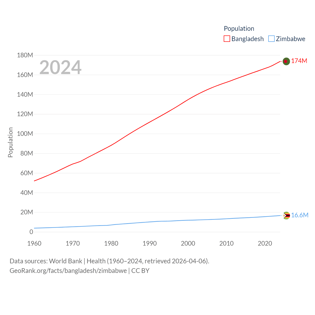 Bangladesh has a population of 174M (ranked 8/197), compared with 16.6M in Zimbabwe (ranked 74/197). Bangladesh's land area is 50,186 sq mi versus 149,364 sq mi for Zimbabwe (ranked 94th vs. 60th).