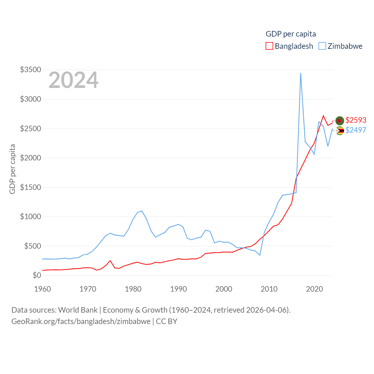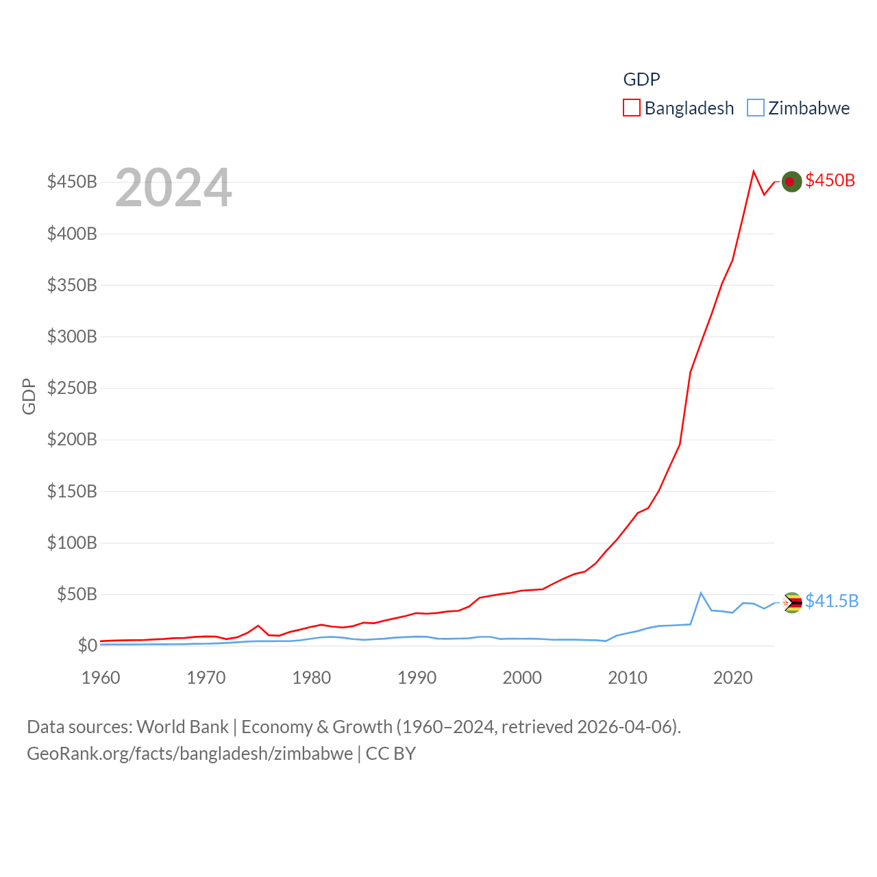 By GDP, Bangladesh ranks 36/197 ($450B) and Zimbabwe ranks 102/197 ($41.5B). By GDP per capita, Bangladesh ranks 146/197 ($2,593), while Zimbabwe ranks 148/197 ($2,497).