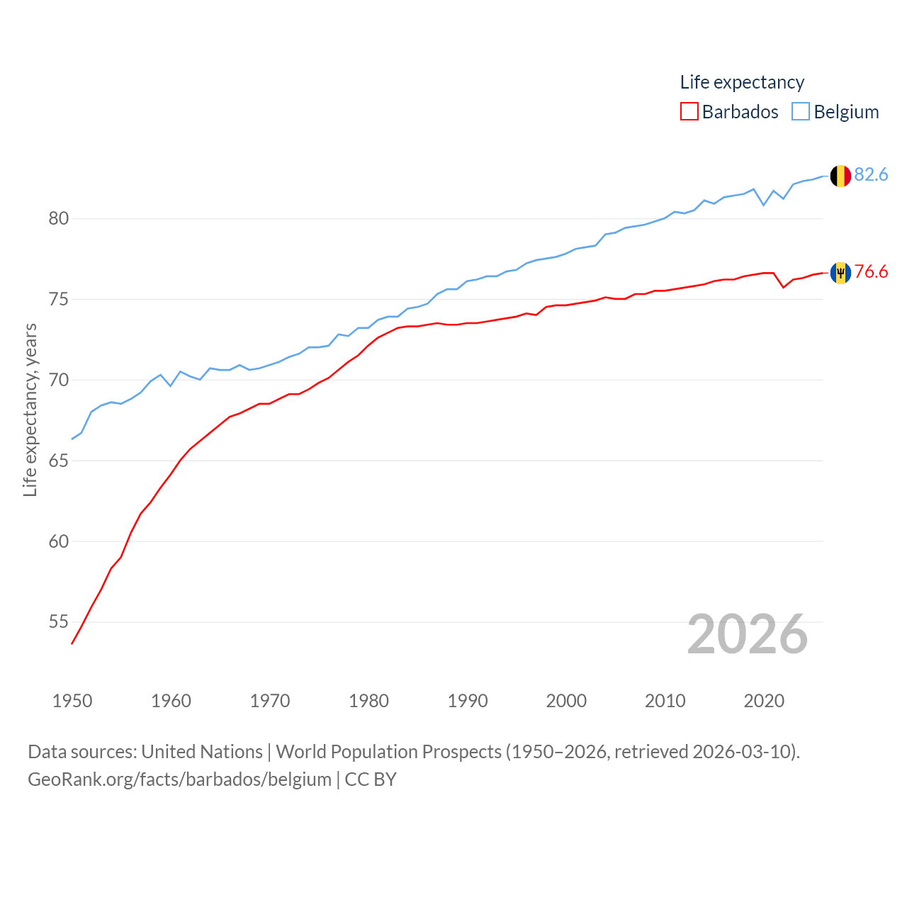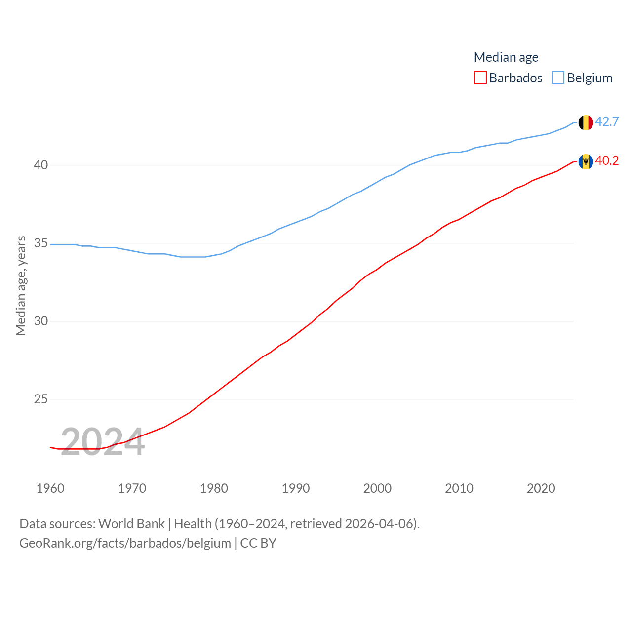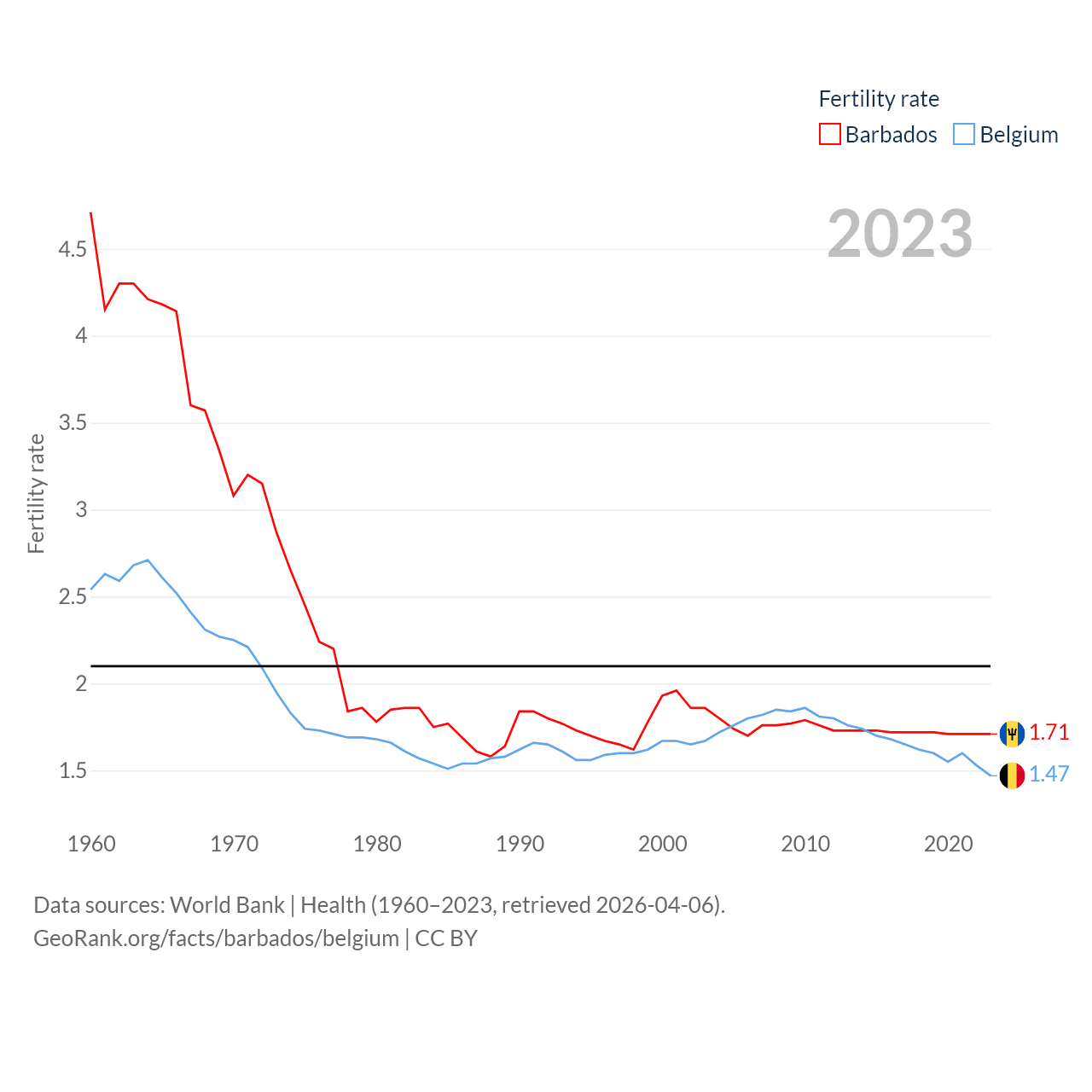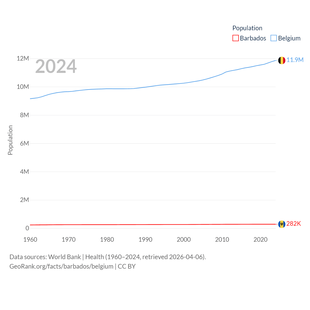 Barbados has a population of 282K (ranked 175/197), compared with 11.9M in Belgium (ranked 82/197). Barbados' land area is 166 sq mi versus 11,774 sq mi for Belgium (ranked 184th vs. 136th).