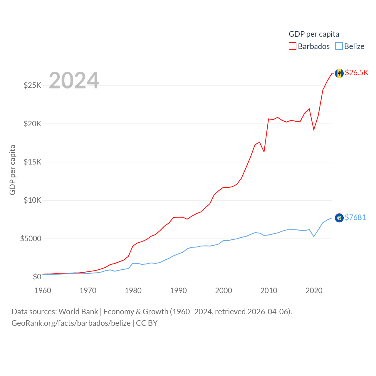By GDP, Barbados ranks 157/197 ($7.5B) and Belize ranks 168/197 ($3.2B). By GDP per capita, Barbados ranks 46/197 ($26,545), while Belize ranks 98/197 ($7,681).