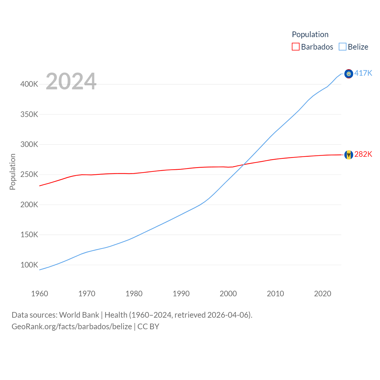 Barbados has a population of 282K (ranked 175/197), compared with 417K in Belize (ranked 171/197). Barbados' land area is 166 sq mi versus 8,807 sq mi for Belize (ranked 184th vs. 148th).