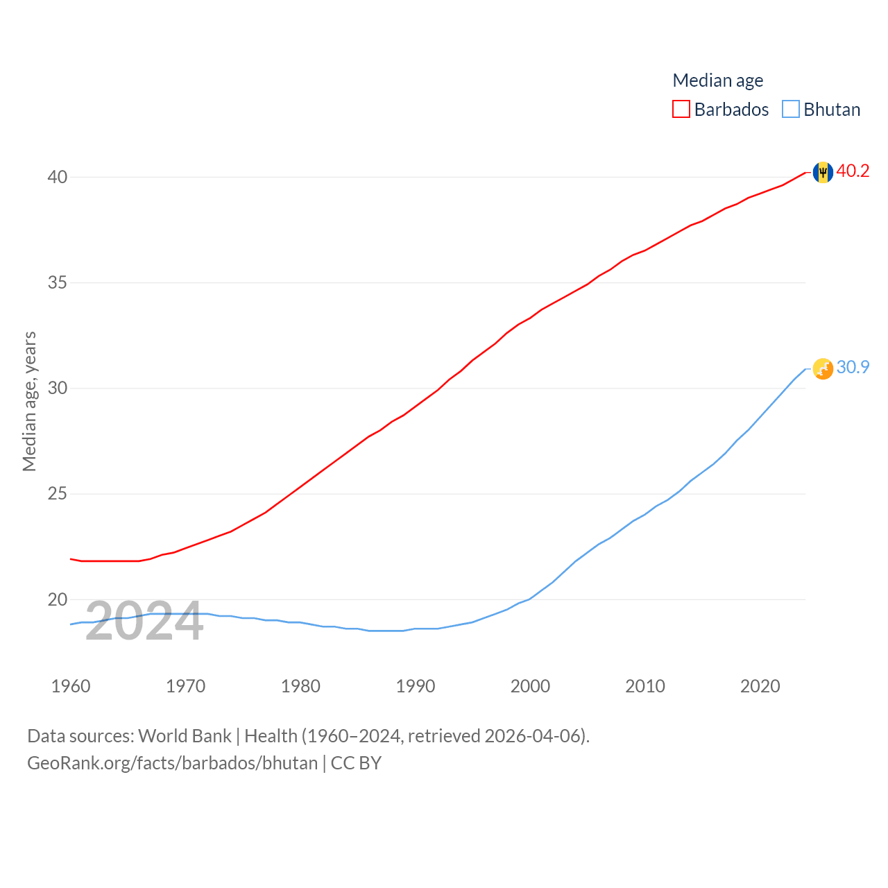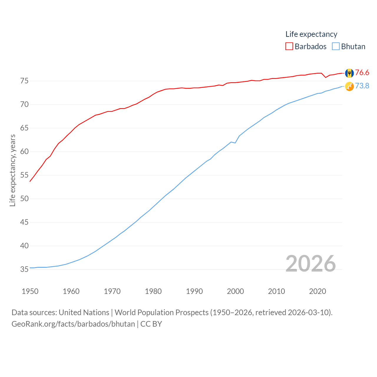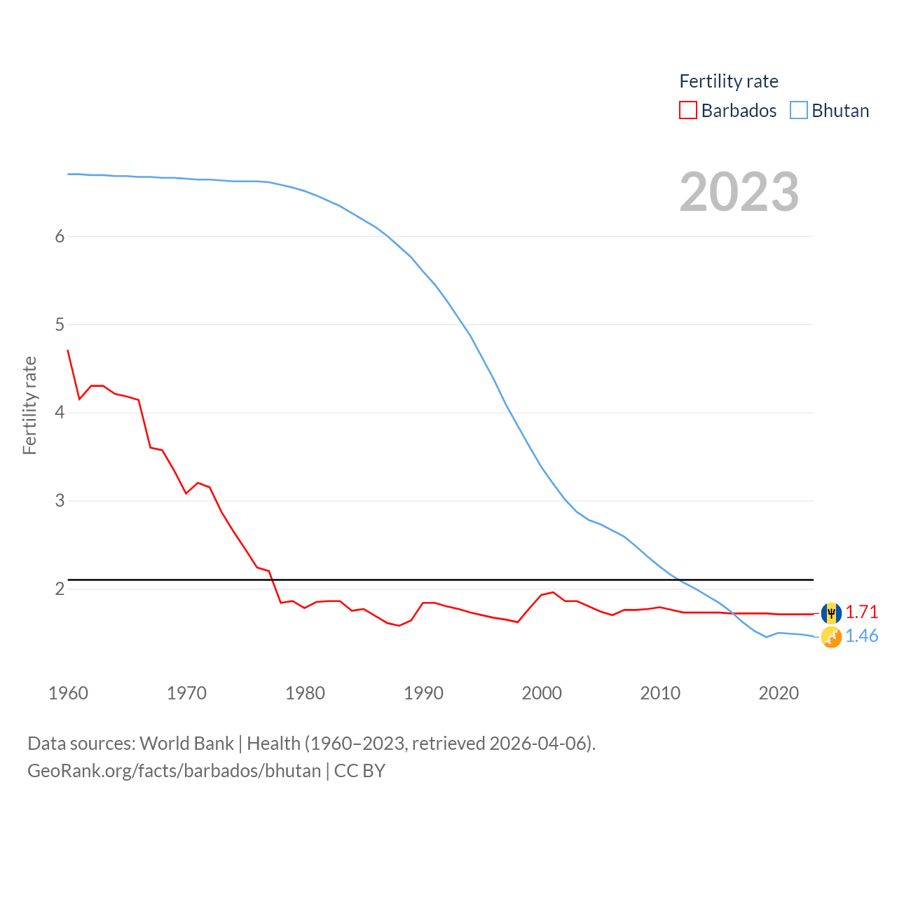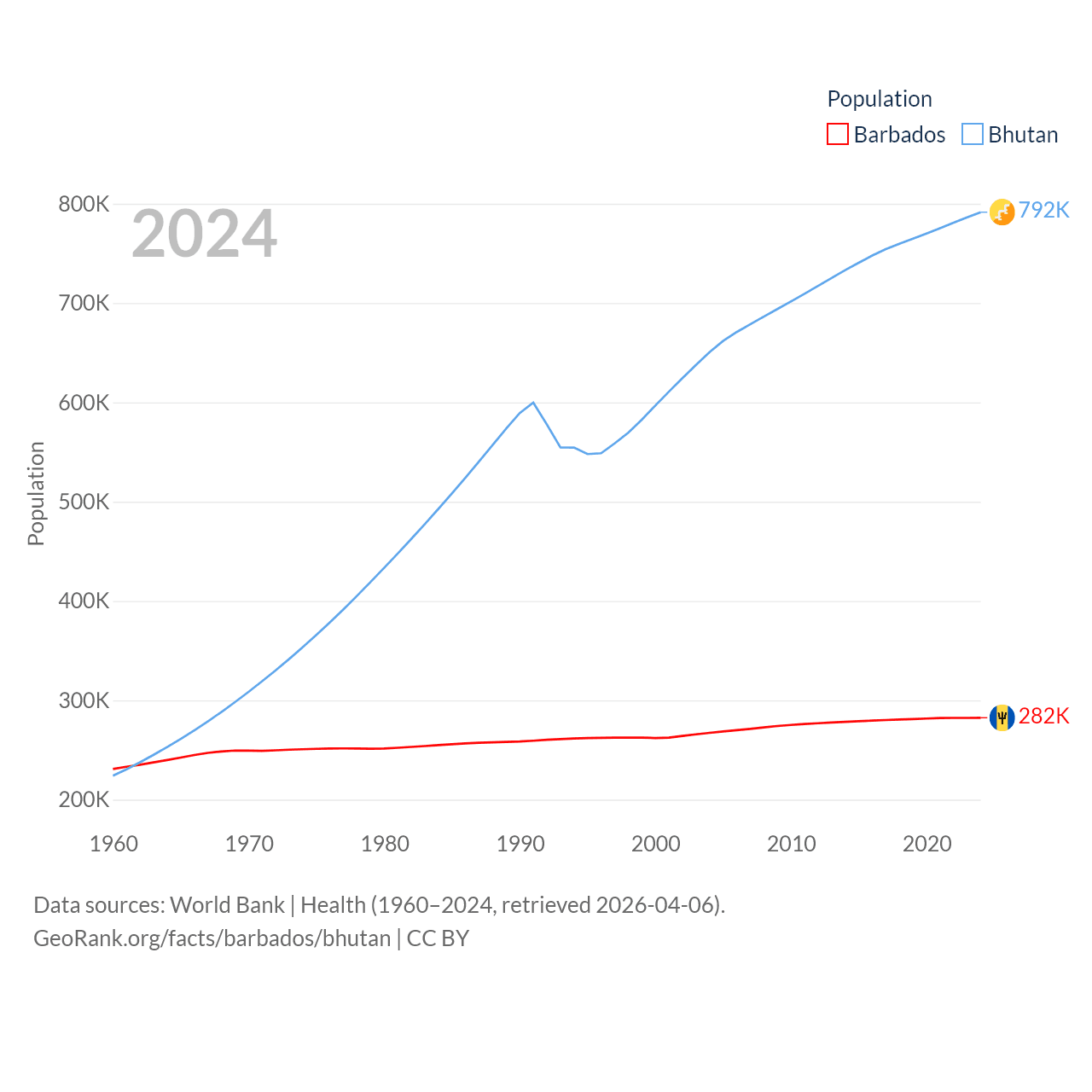 Barbados has a population of 282K (ranked 175/197), compared with 792K in Bhutan (ranked 163/197). Barbados' land area is 166 sq mi versus 14,726 sq mi for Bhutan (ranked 184th vs. 132nd).