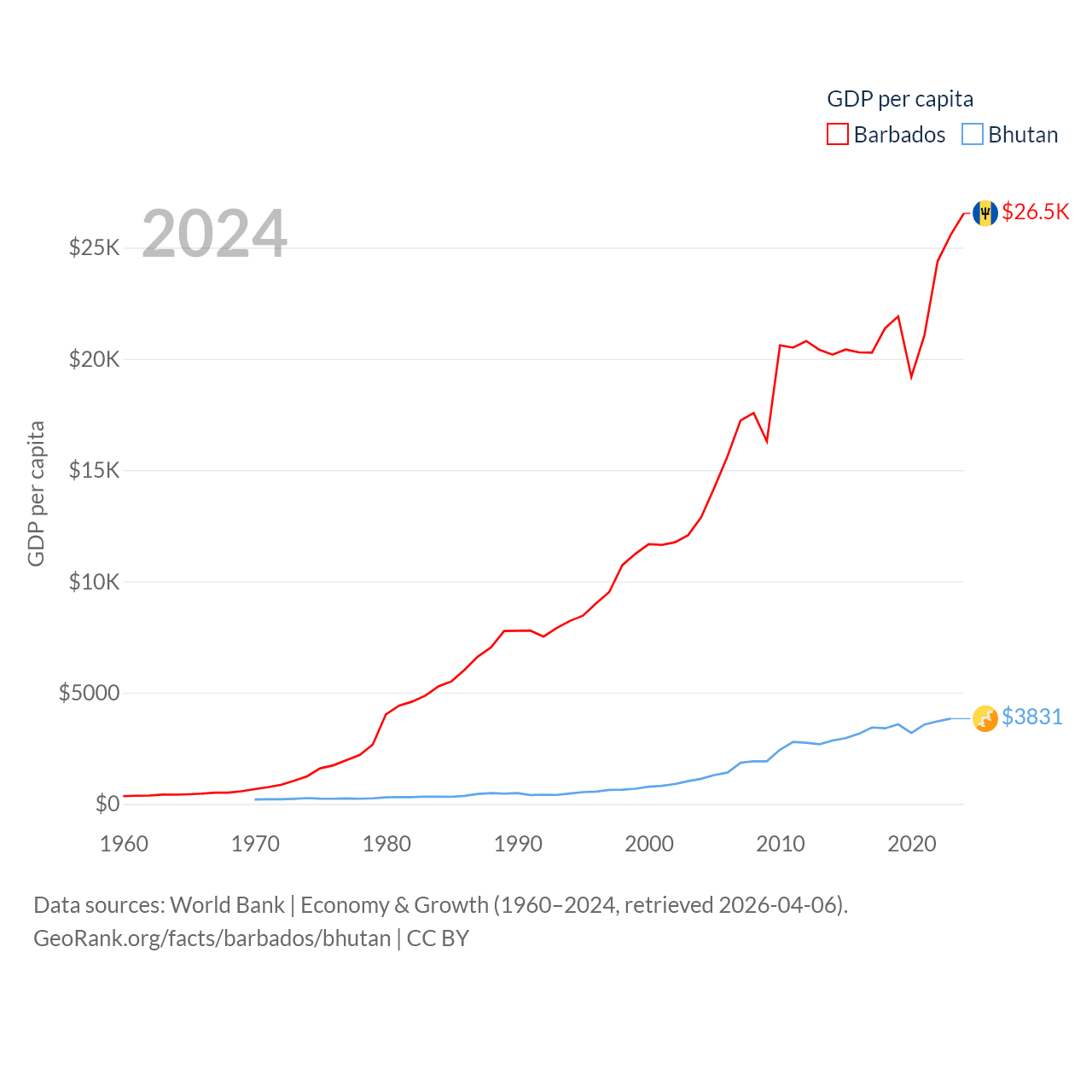 By GDP, Barbados ranks 157/197 ($7.5B) and Bhutan ranks 170/197 ($3.01B). By GDP per capita, Barbados ranks 46/197 ($26,545), while Bhutan ranks 132/197 ($3,831).