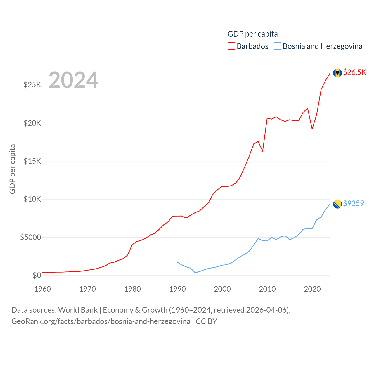 By GDP, Barbados ranks 157/197 ($7.5B) and Bosnia and Herzegovina ranks 111/197 ($29.6B). By GDP per capita, Barbados ranks 46/197 ($26,545), while Bosnia and Herzegovina ranks 87/197 ($9,359).