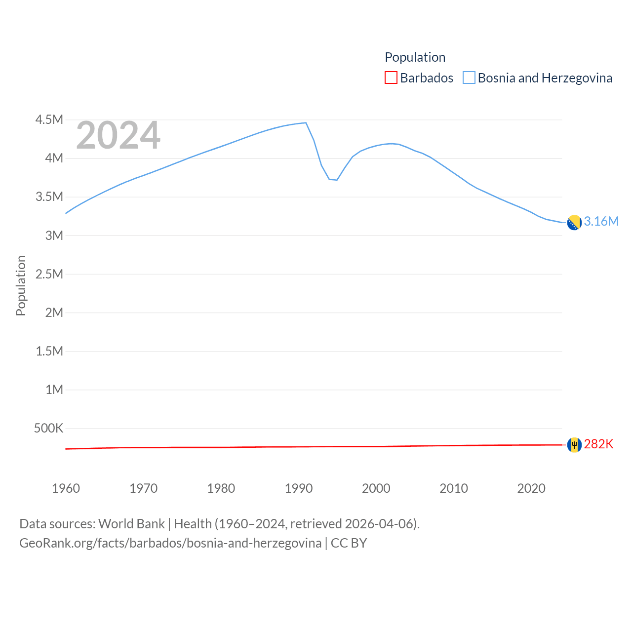 Barbados has a population of 282K (ranked 175/197), compared with 3.16M in Bosnia and Herzegovina (ranked 134/197). Barbados' land area is 166 sq mi versus 19,768 sq mi for Bosnia and Herzegovina (ranked 184th vs. 125th).