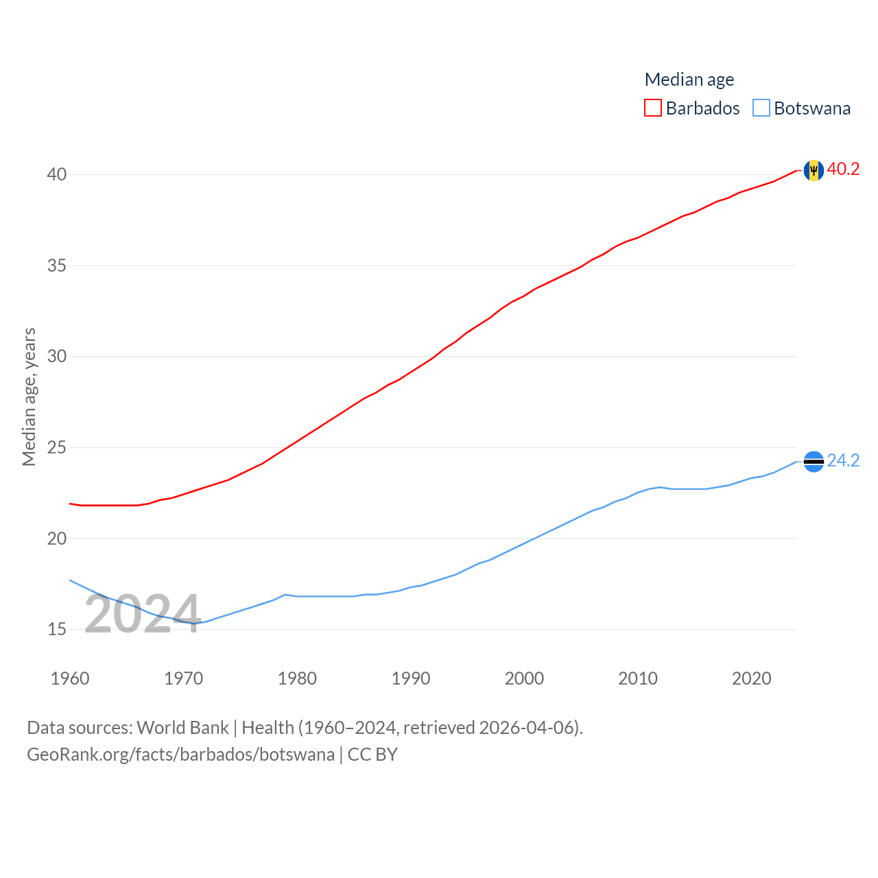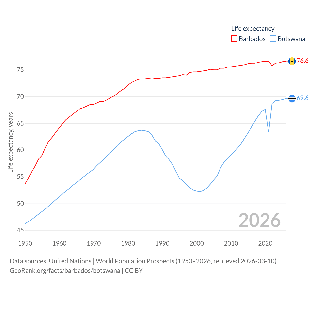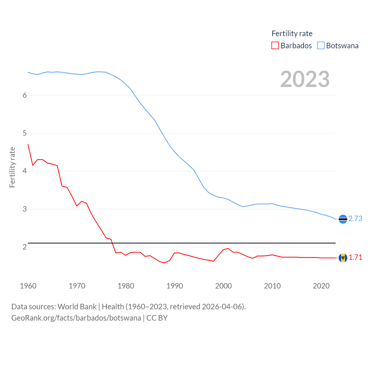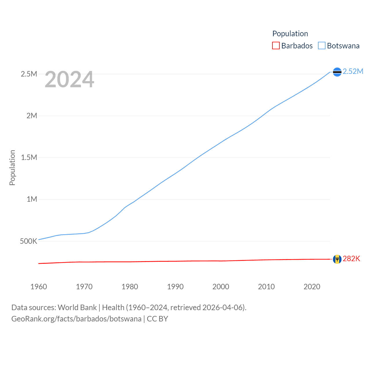 Barbados has a population of 282K (ranked 175/197), compared with 2.52M in Botswana (ranked 142/197). Barbados' land area is 166 sq mi versus 218,816 sq mi for Botswana (ranked 184th vs. 47th).