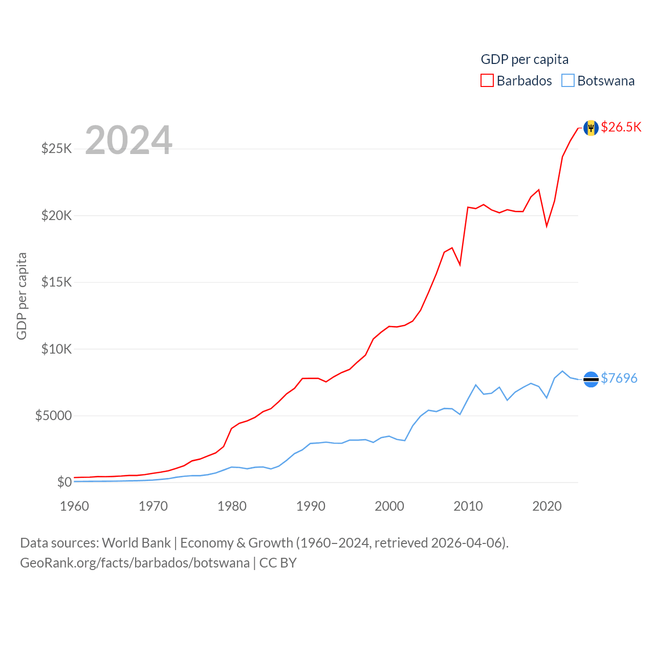 By GDP, Barbados ranks 157/197 ($7.5B) and Botswana ranks 133/197 ($19.4B). By GDP per capita, Barbados ranks 46/197 ($26,545), while Botswana ranks 97/197 ($7,696).