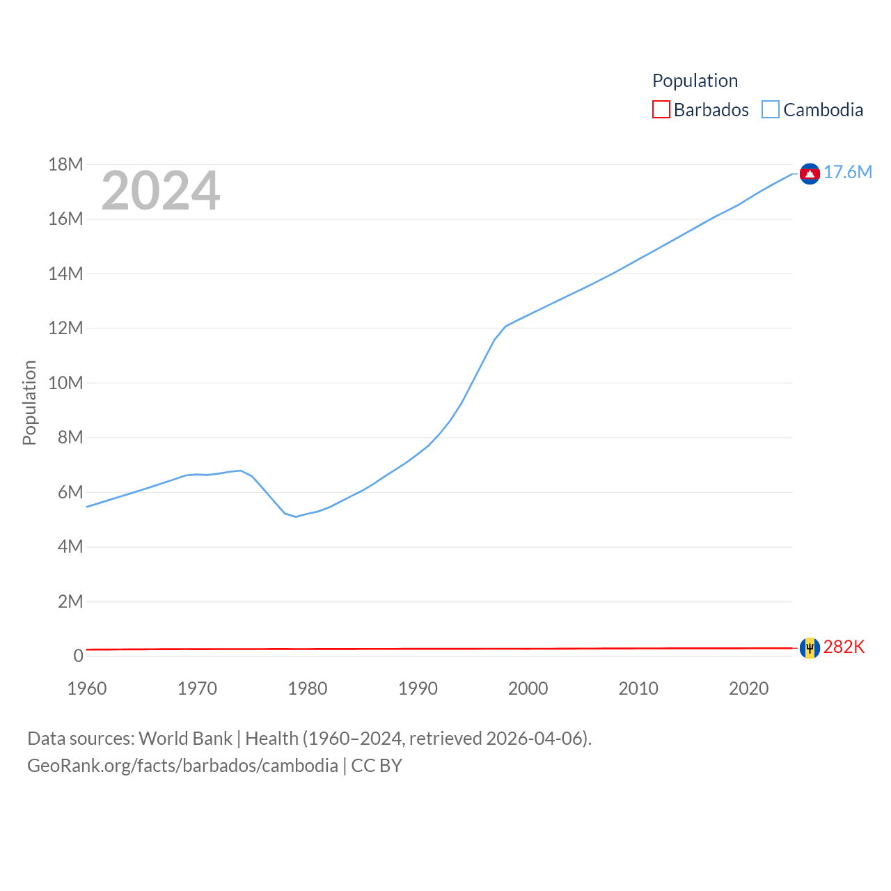 Barbados has a population of 282K (ranked 175/197), compared with 17.6M in Cambodia (ranked 73/197). Barbados' land area is 166 sq mi versus 68,155 sq mi for Cambodia (ranked 184th vs. 88th).