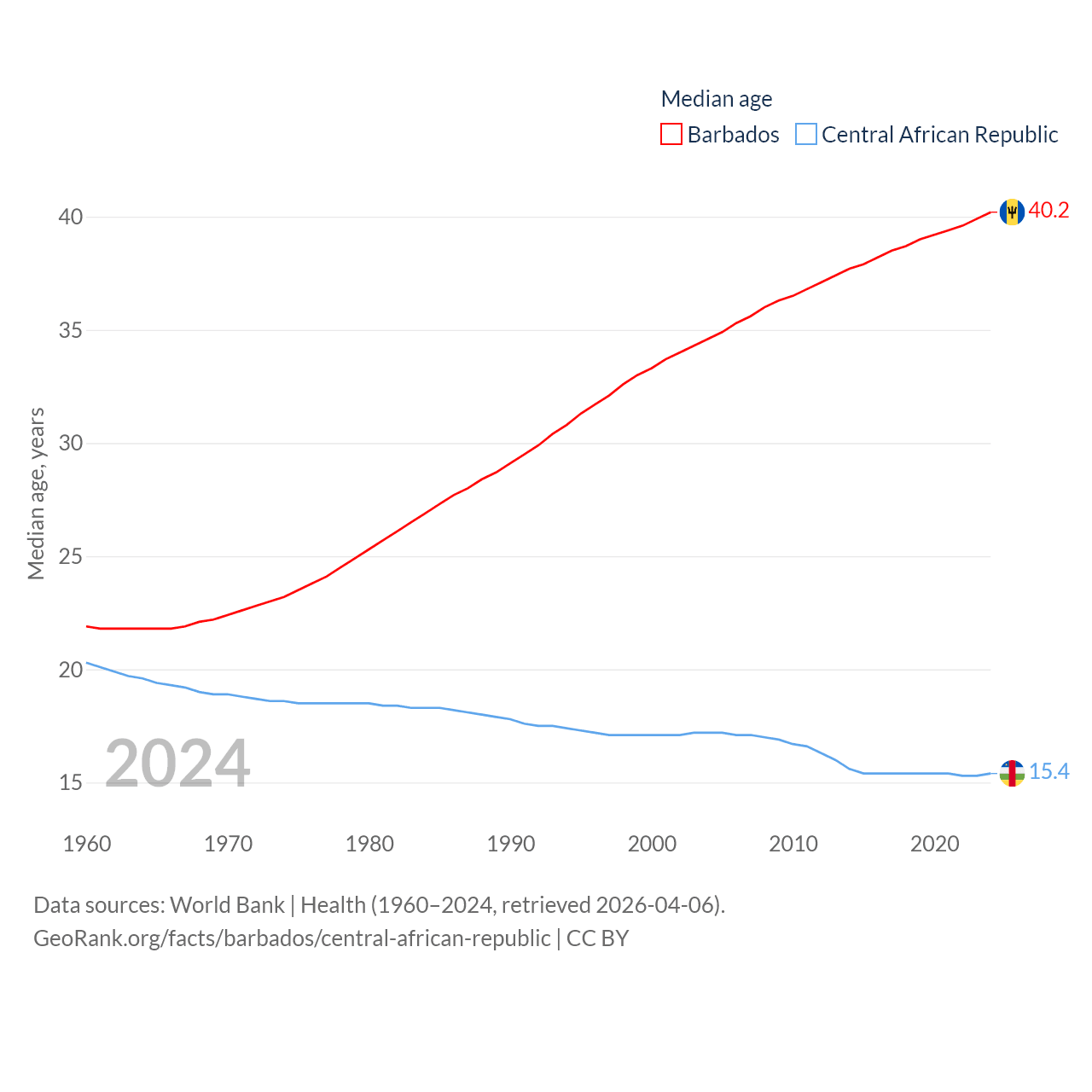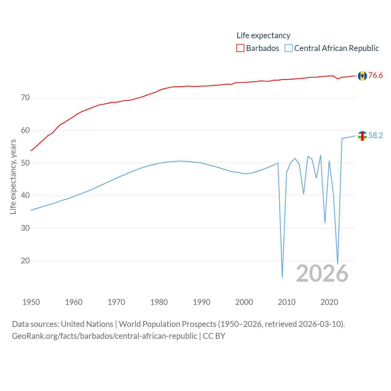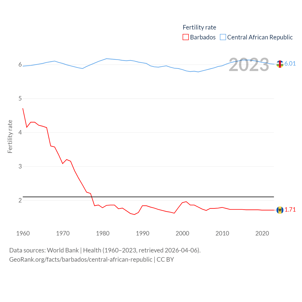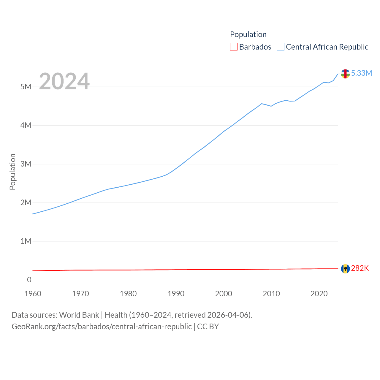 Barbados has a population of 282K (ranked 175/197), compared with 5.33M in The Central African Republic (ranked 121/197). Barbados' land area is 166 sq mi versus 240,534 sq mi for The Central African Republic (ranked 184th vs. 43rd).