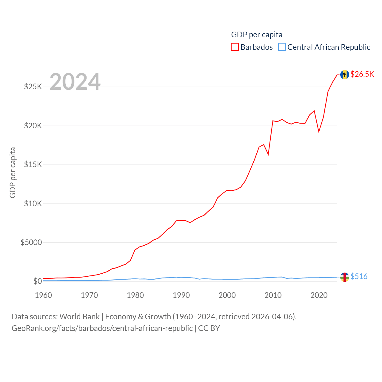 By GDP, Barbados ranks 157/197 ($7.5B) and The Central African Republic ranks 171/197 ($2.75B). By GDP per capita, Barbados ranks 46/197 ($26,545), while The Central African Republic ranks 195/197 ($516).
