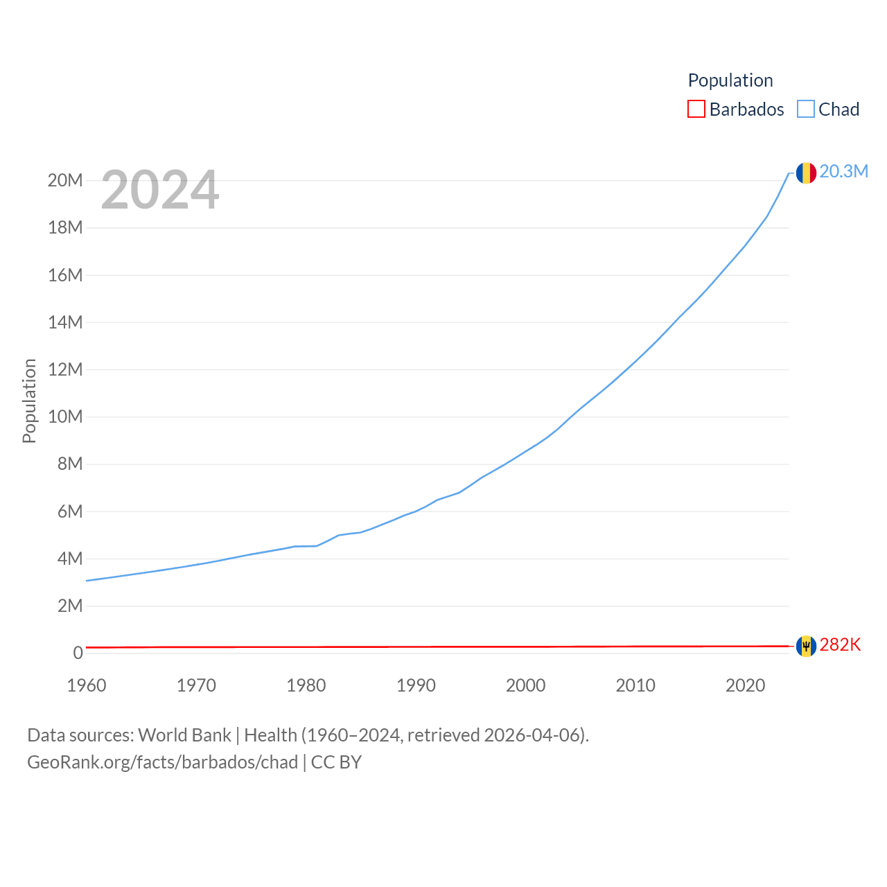 Barbados has a population of 282K (ranked 175/197), compared with 20.3M in Chad (ranked 65/197). Barbados' land area is 166 sq mi versus 486,180 sq mi for Chad (ranked 184th vs. 21st).