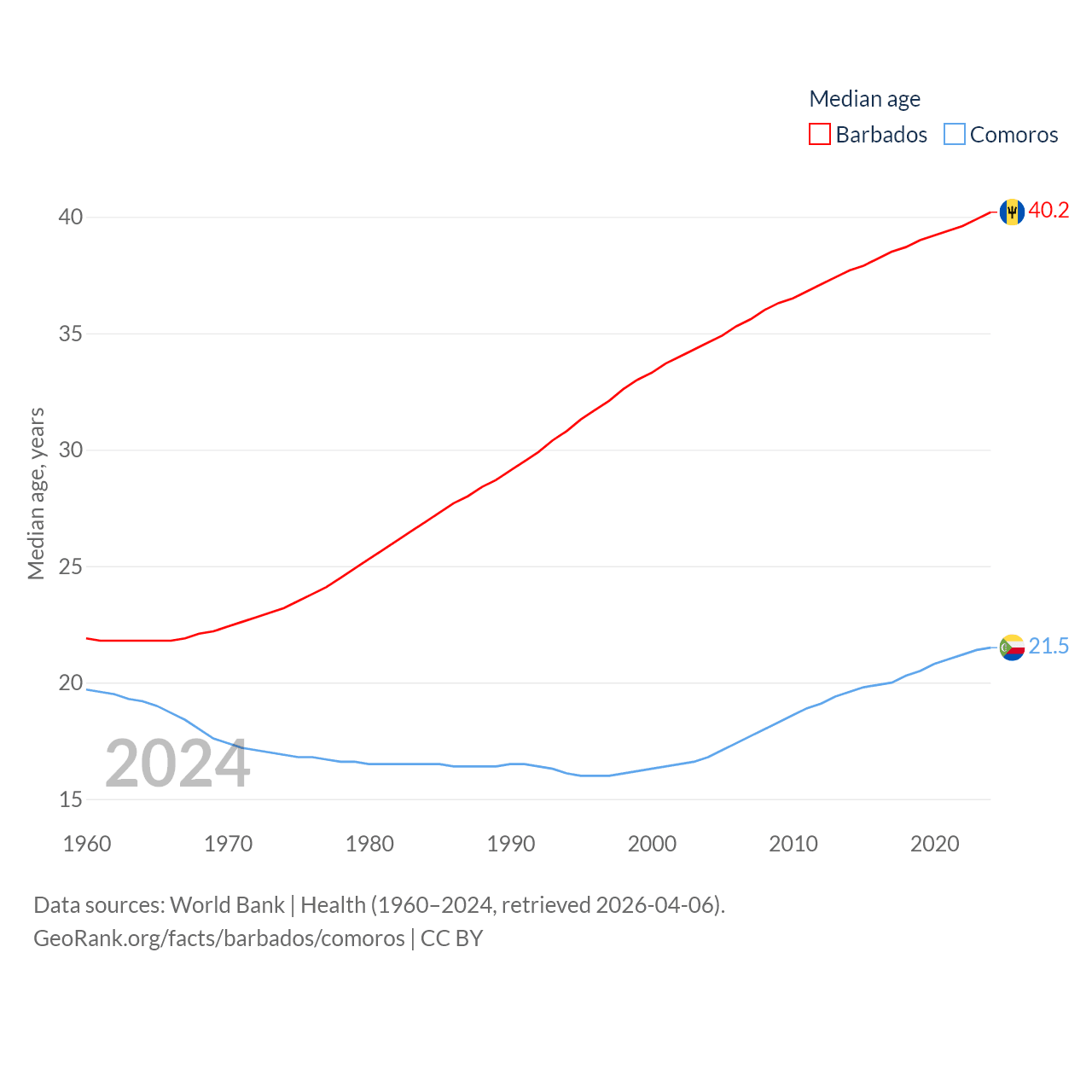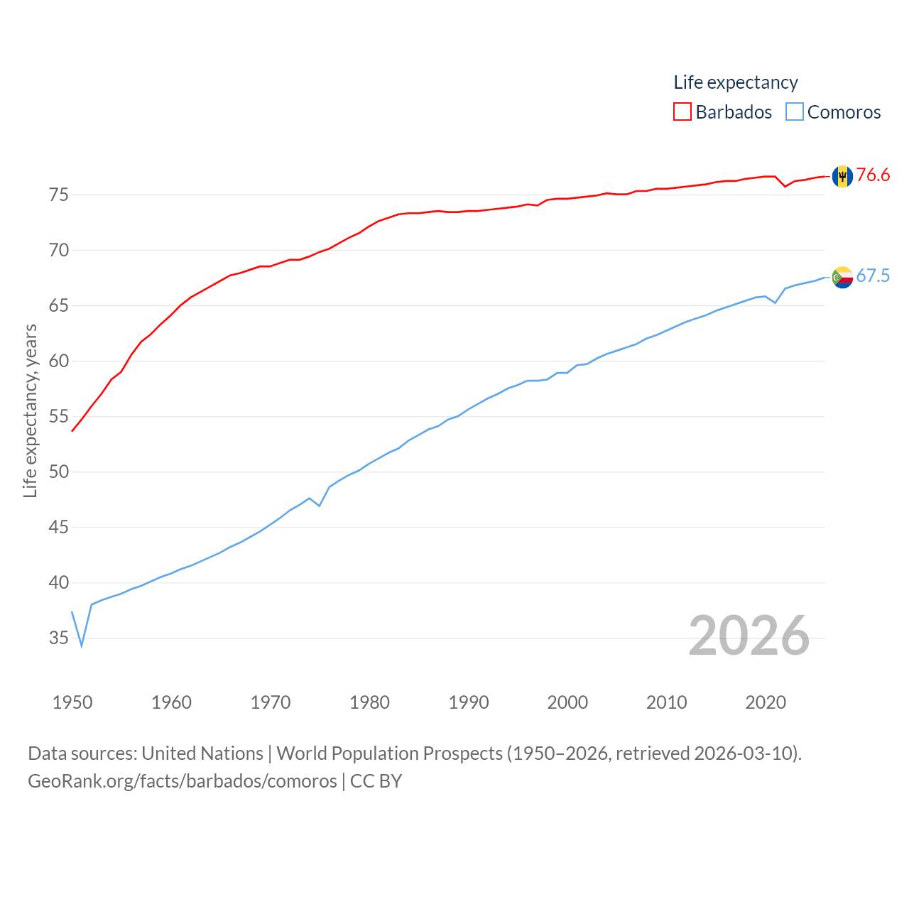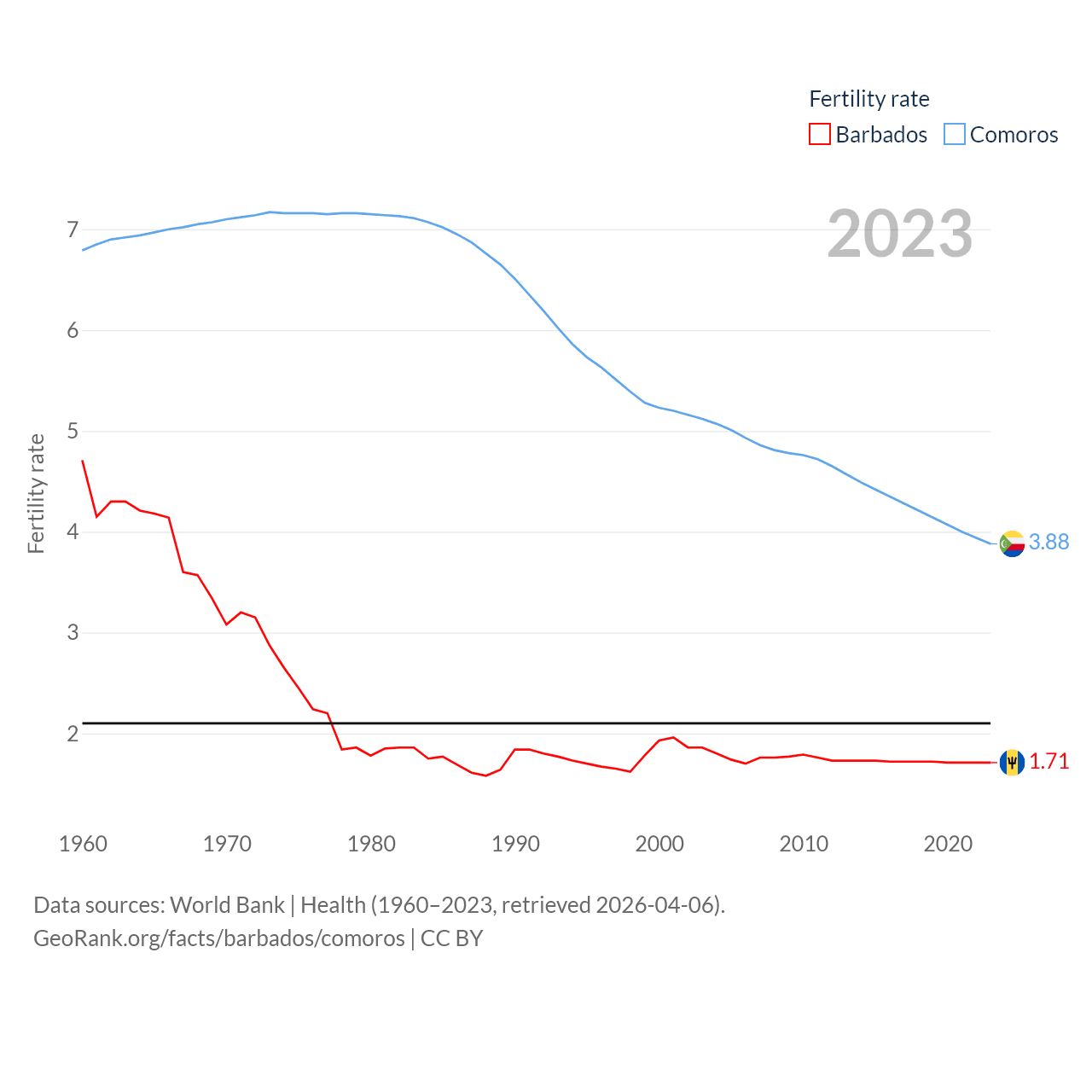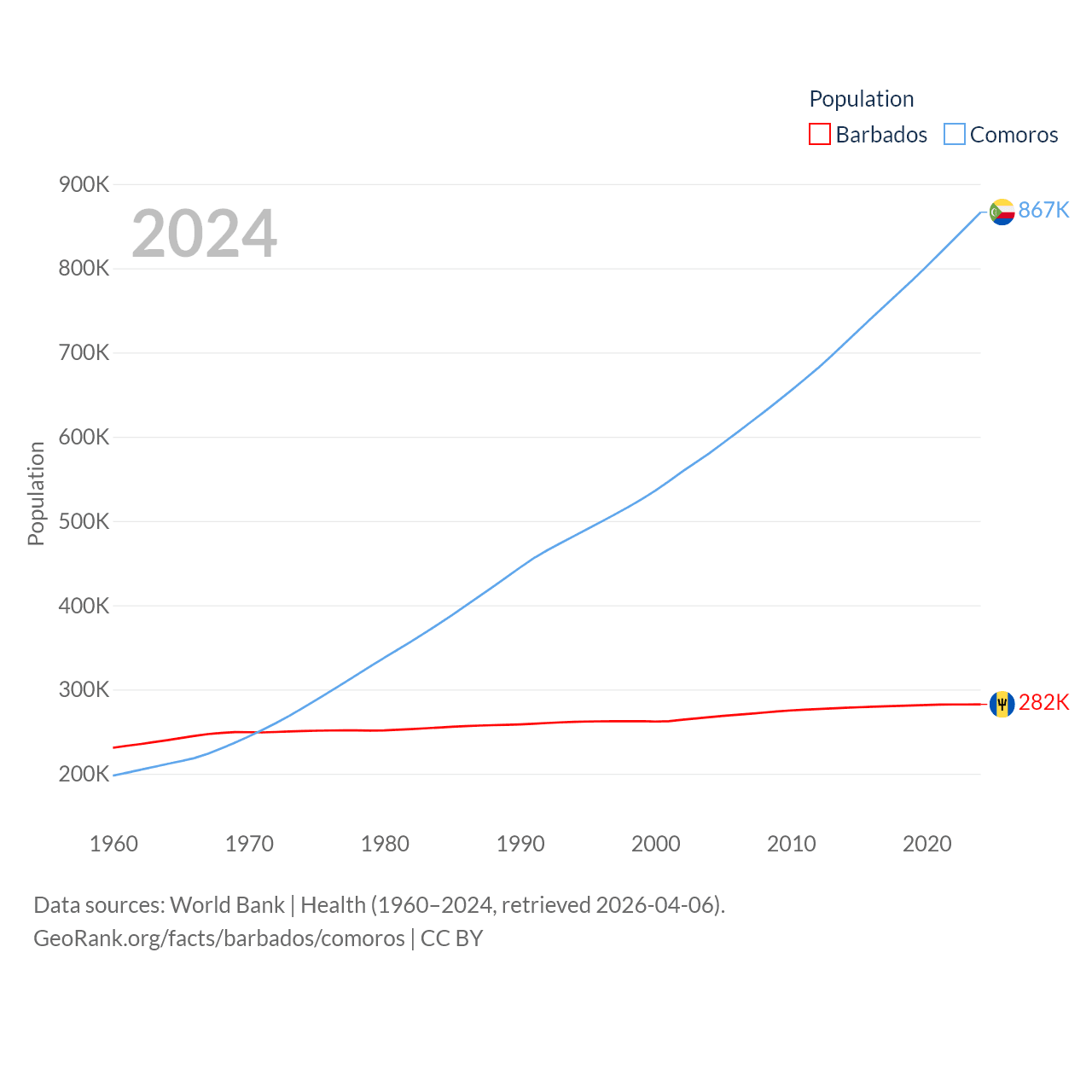 Barbados has a population of 282K (ranked 175/197), compared with 867K in Comoros (ranked 160/197). Barbados' land area is 166 sq mi versus 719 sq mi for Comoros (ranked 184th vs. 171st).