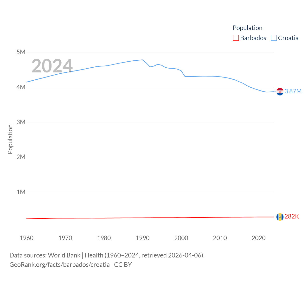 Barbados has a population of 282K (ranked 175/197), compared with 3.87M in Croatia (ranked 129/197). Barbados' land area is 166 sq mi versus 21,606 sq mi for Croatia (ranked 184th vs. 123rd).