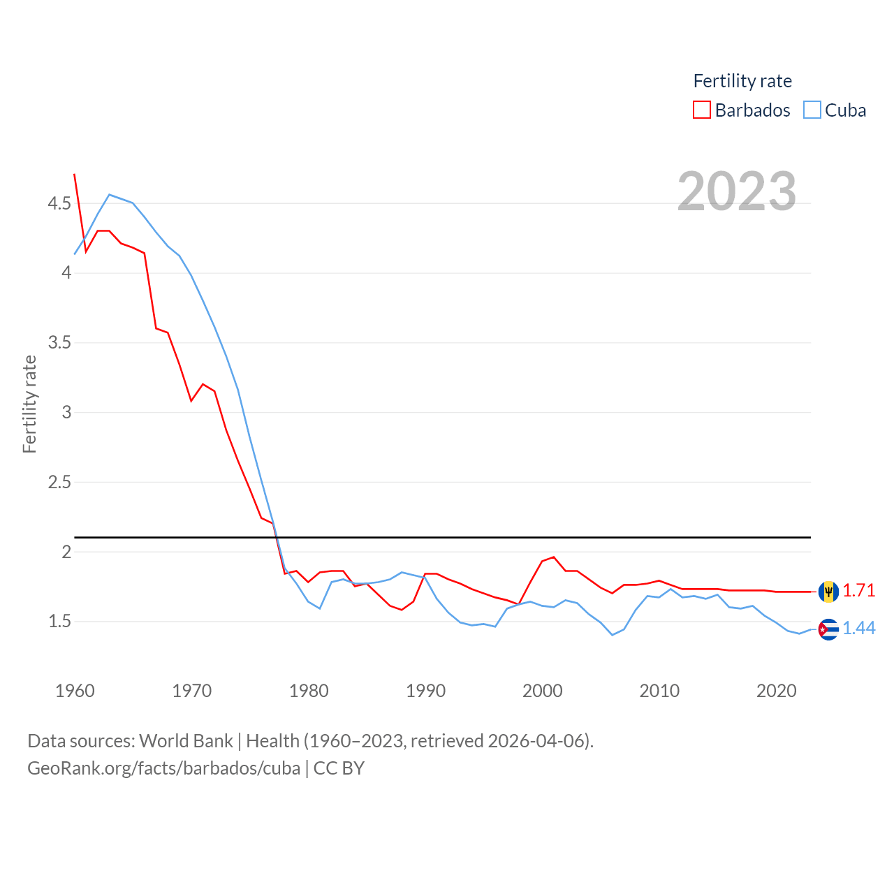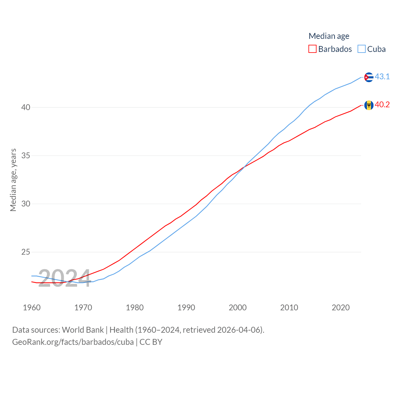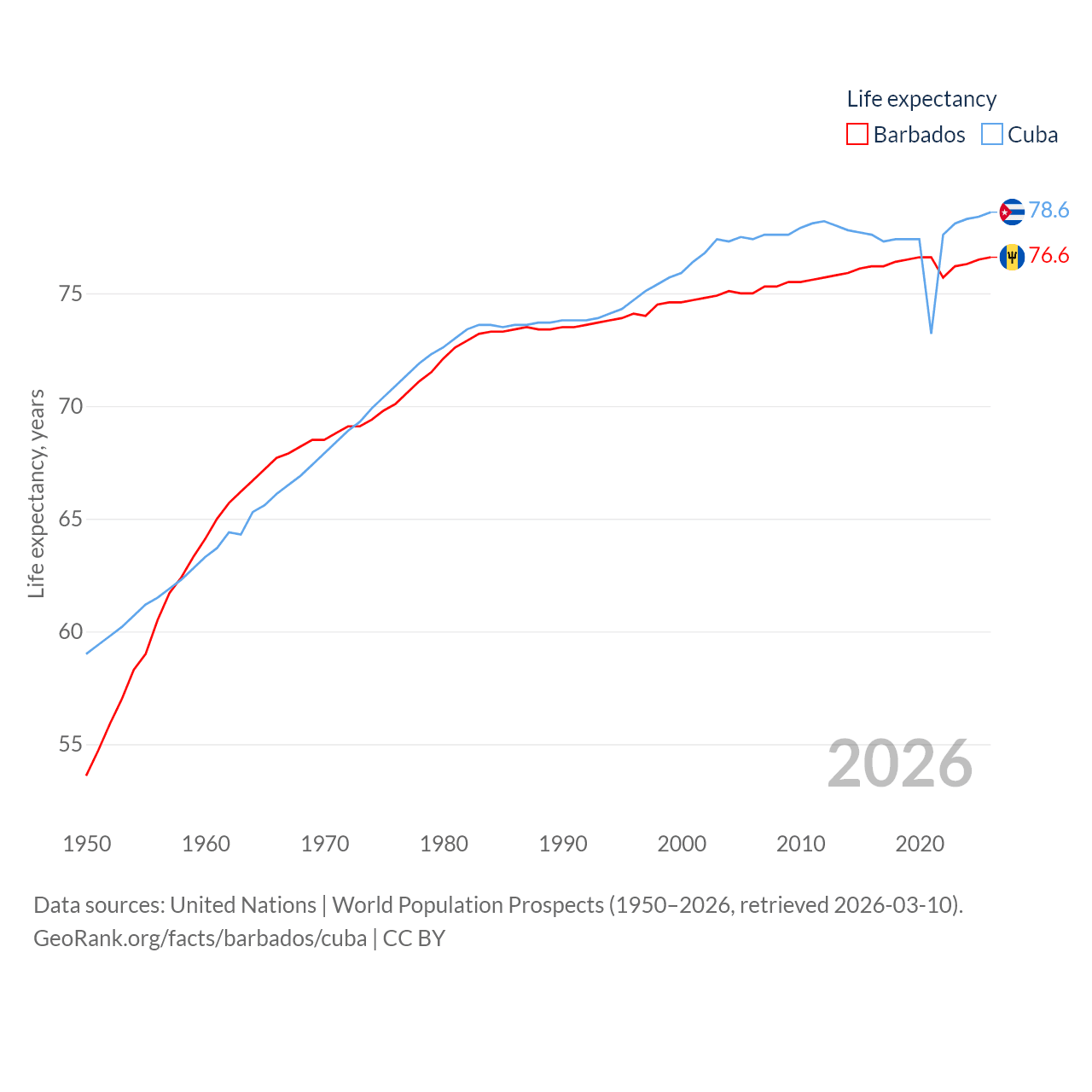 Barbados has a population of 282K (ranked 175/197), compared with 11M in Cuba (ranked 87/197). Barbados' land area is 166 sq mi versus 40,077 sq mi for Cuba (ranked 184th vs. 103rd).