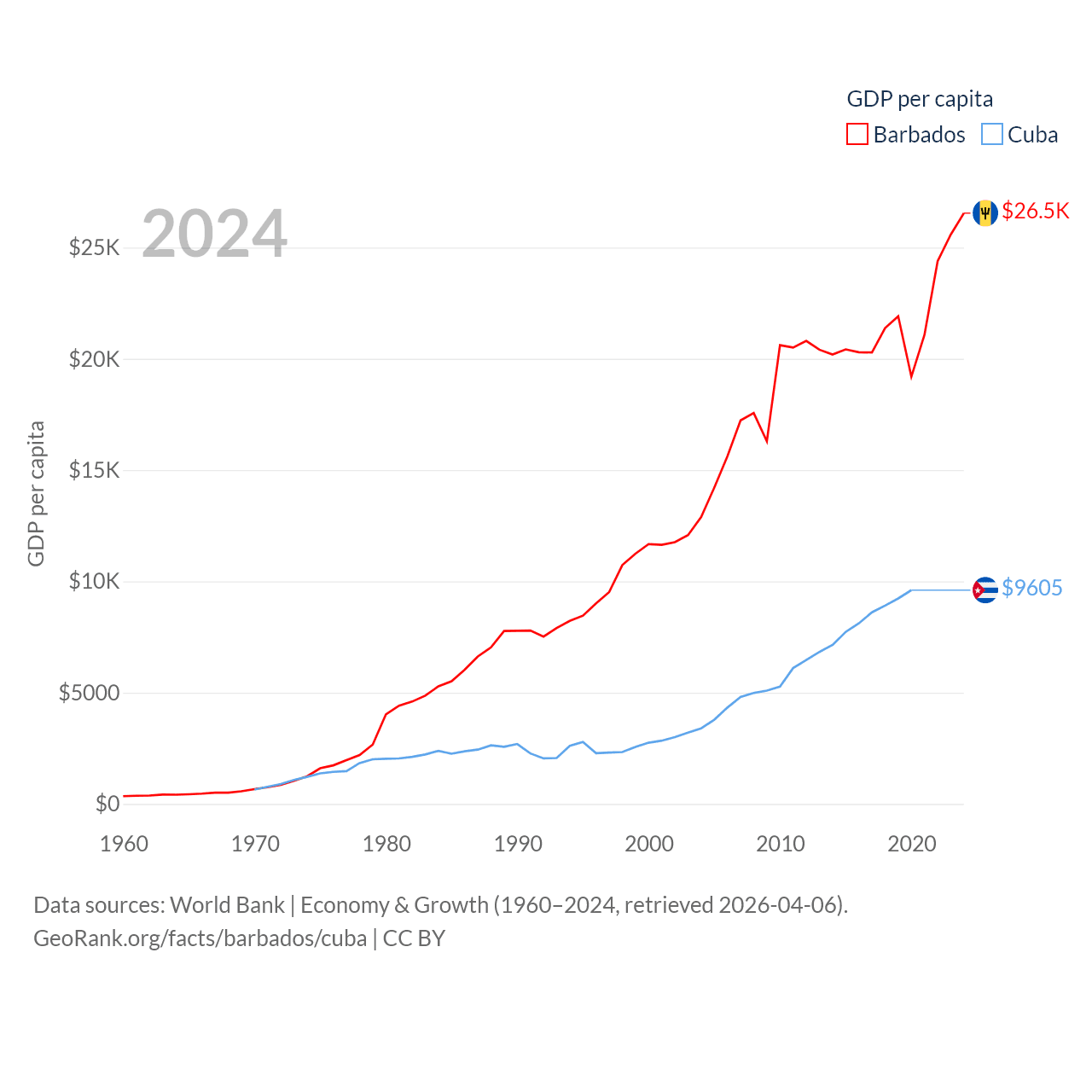 By GDP, Barbados ranks 157/197 ($7.5B) and Cuba ranks 69/197 ($107B). By GDP per capita, Barbados ranks 46/197 ($26,545), while Cuba ranks 86/197 ($9,605).
