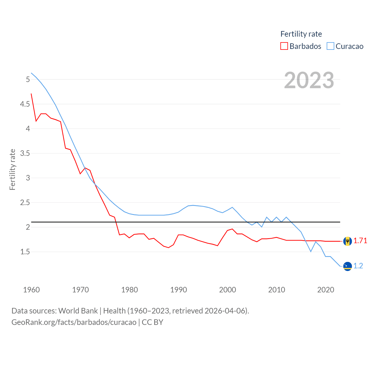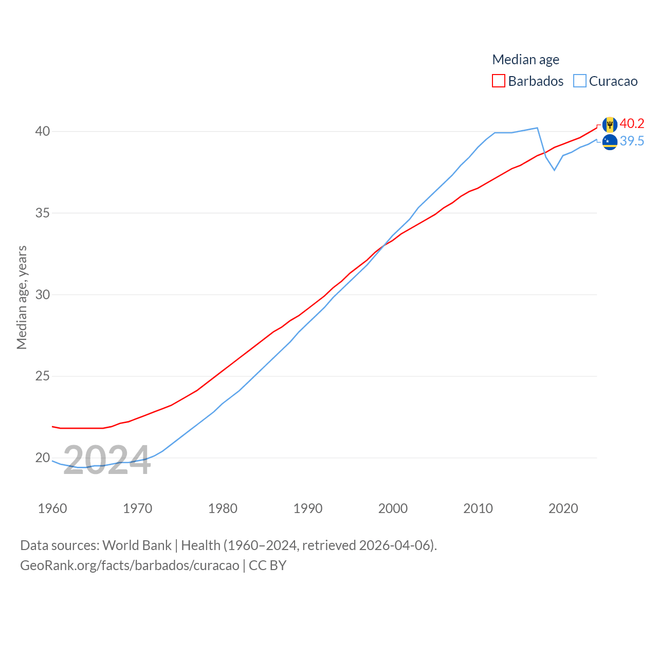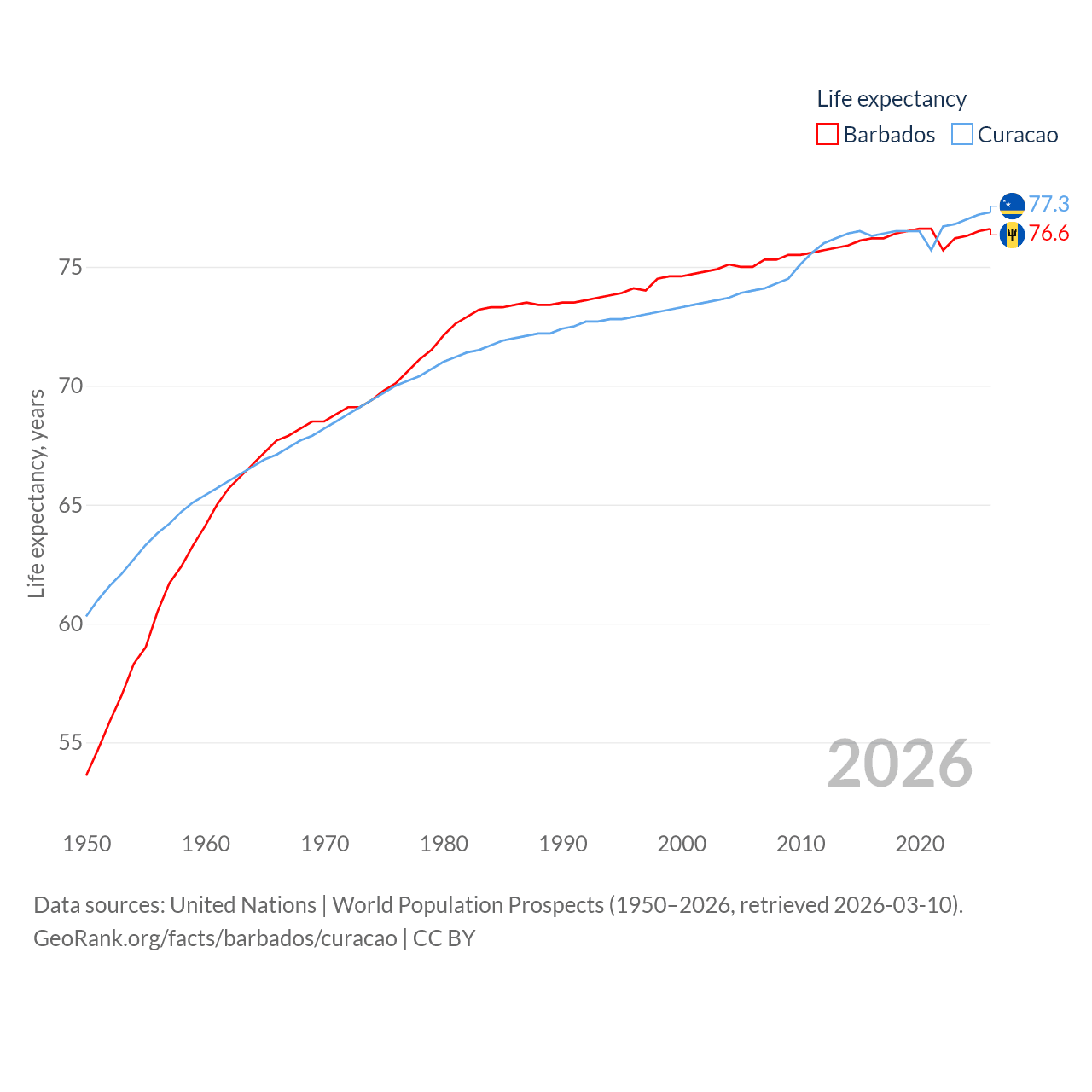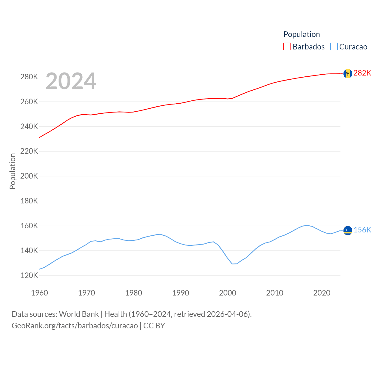 Barbados has a population of 282K (ranked 175/197), compared with 156K in Curacao (ranked 179/197). Barbados' land area is 166 sq mi versus 171.4 sq mi for Curacao (ranked 184th vs. 182nd).