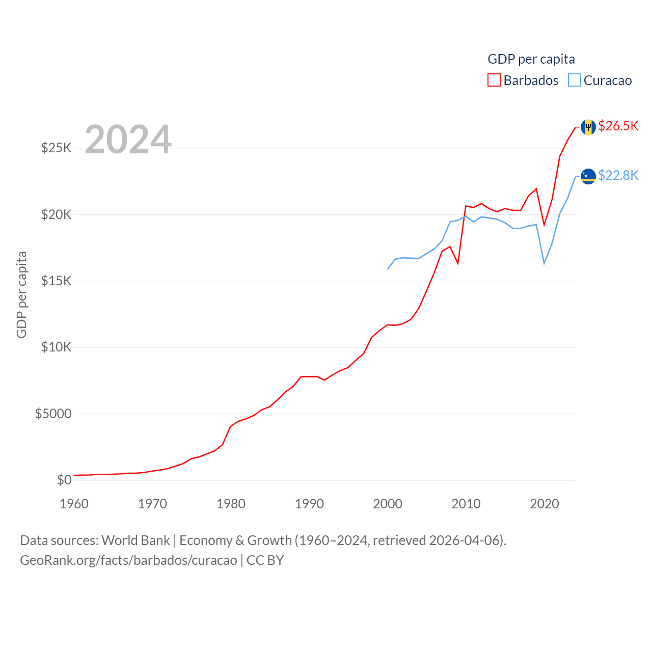 By GDP, Barbados ranks 157/197 ($7.5B) and Curacao ranks 167/197 ($3.56B). By GDP per capita, Barbados ranks 46/197 ($26,545), while Curacao ranks 56/197 ($22,833).
