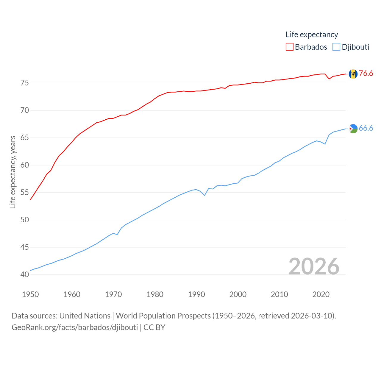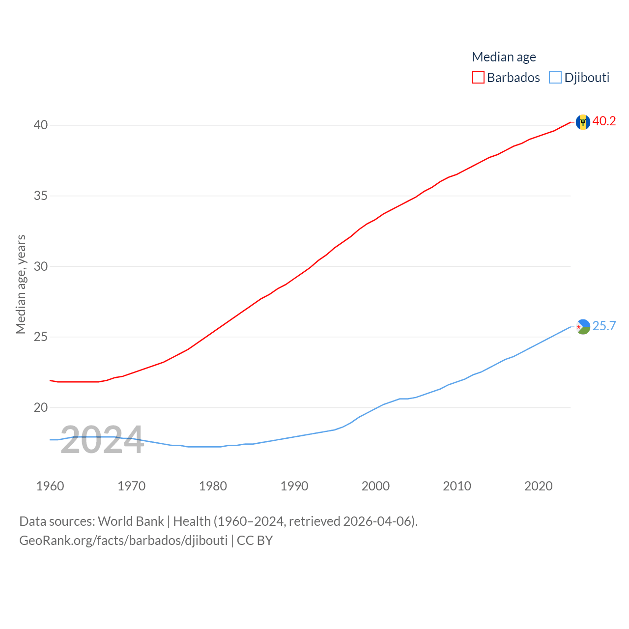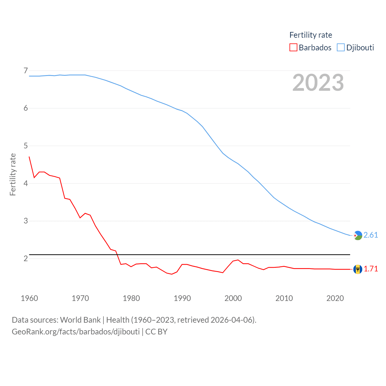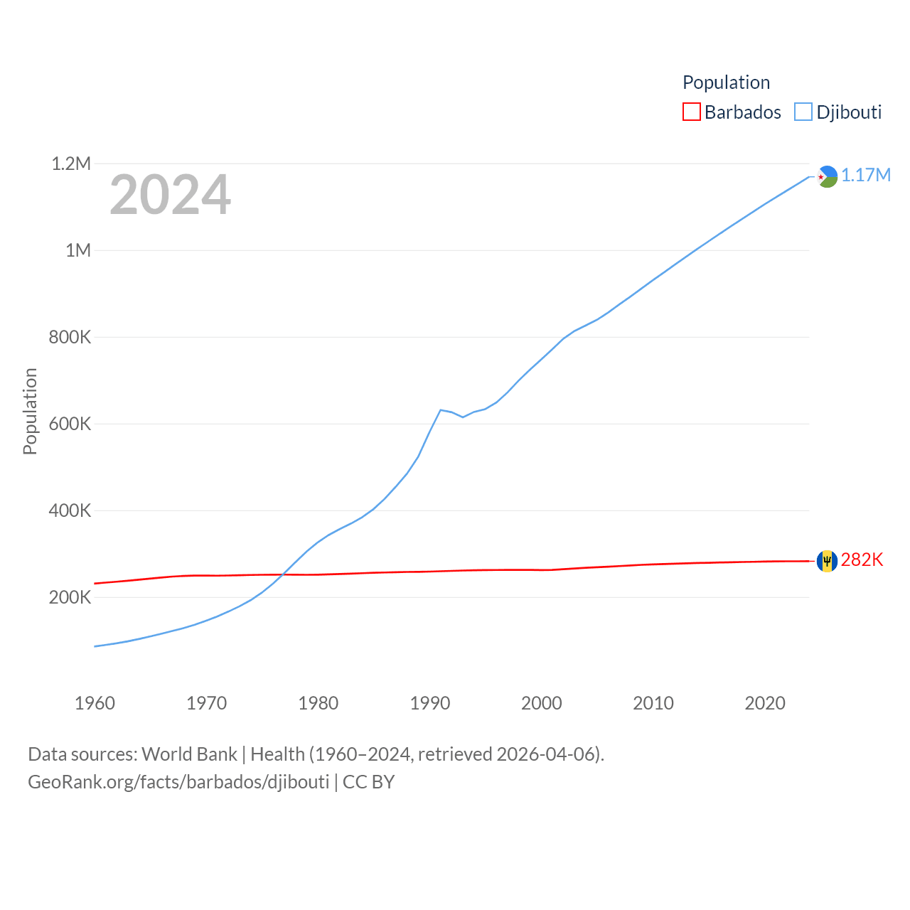 Barbados has a population of 282K (ranked 175/197), compared with 1.17M in Djibouti (ranked 158/197). Barbados' land area is 166 sq mi versus 8,950 sq mi for Djibouti (ranked 184th vs. 147th).