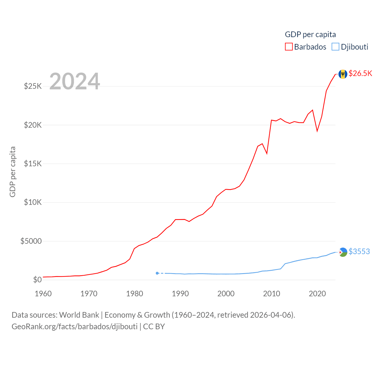 By GDP, Barbados ranks 157/197 ($7.5B) and Djibouti ranks 165/197 ($4.15B). By GDP per capita, Barbados ranks 46/197 ($26,545), while Djibouti ranks 133/197 ($3,553).