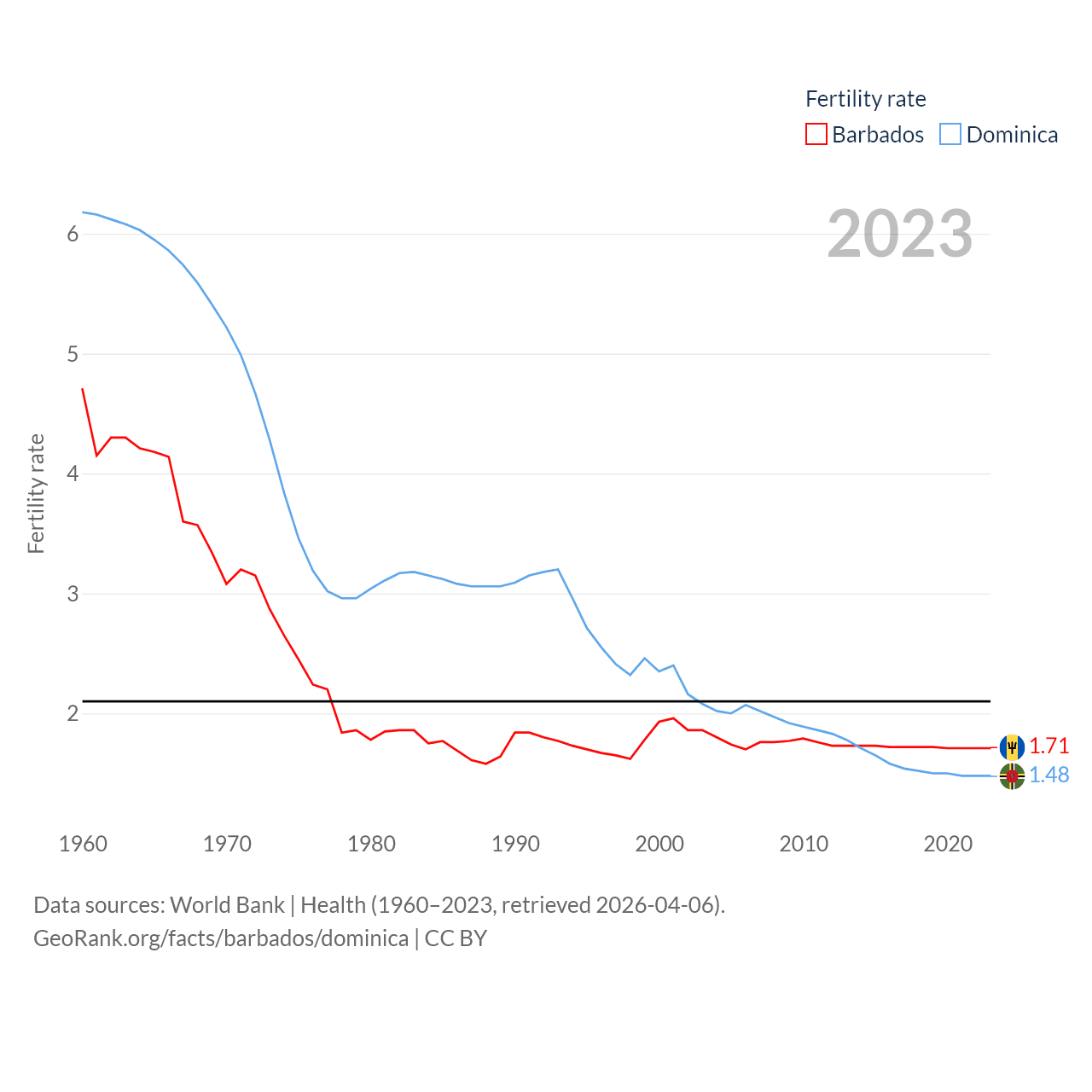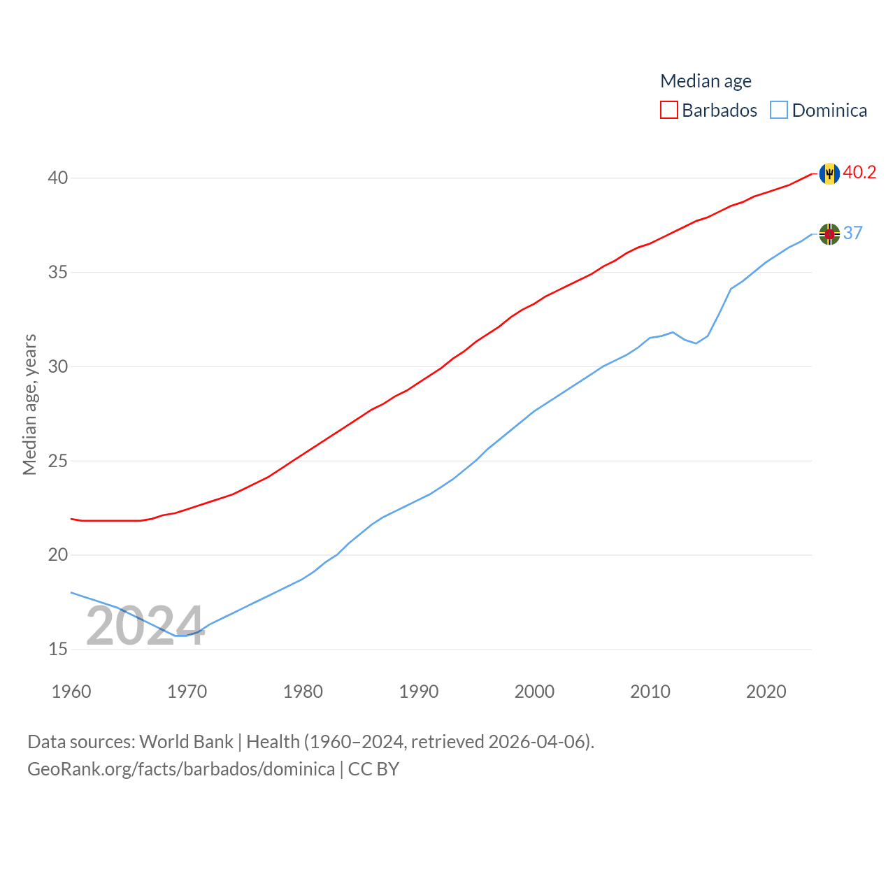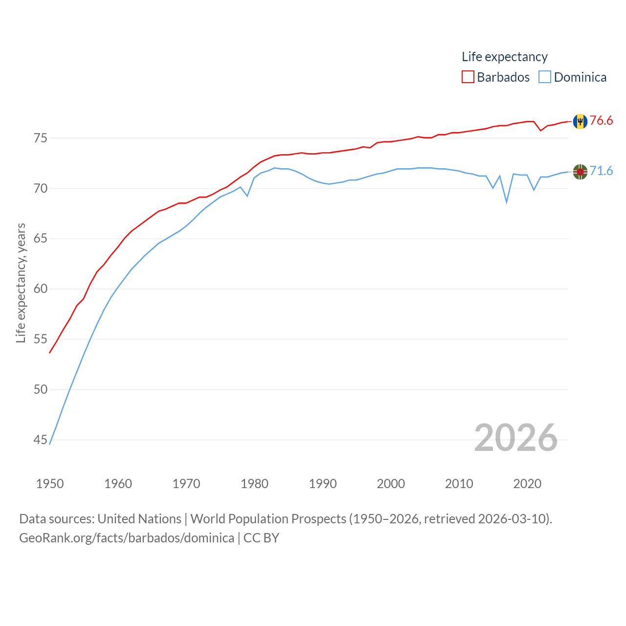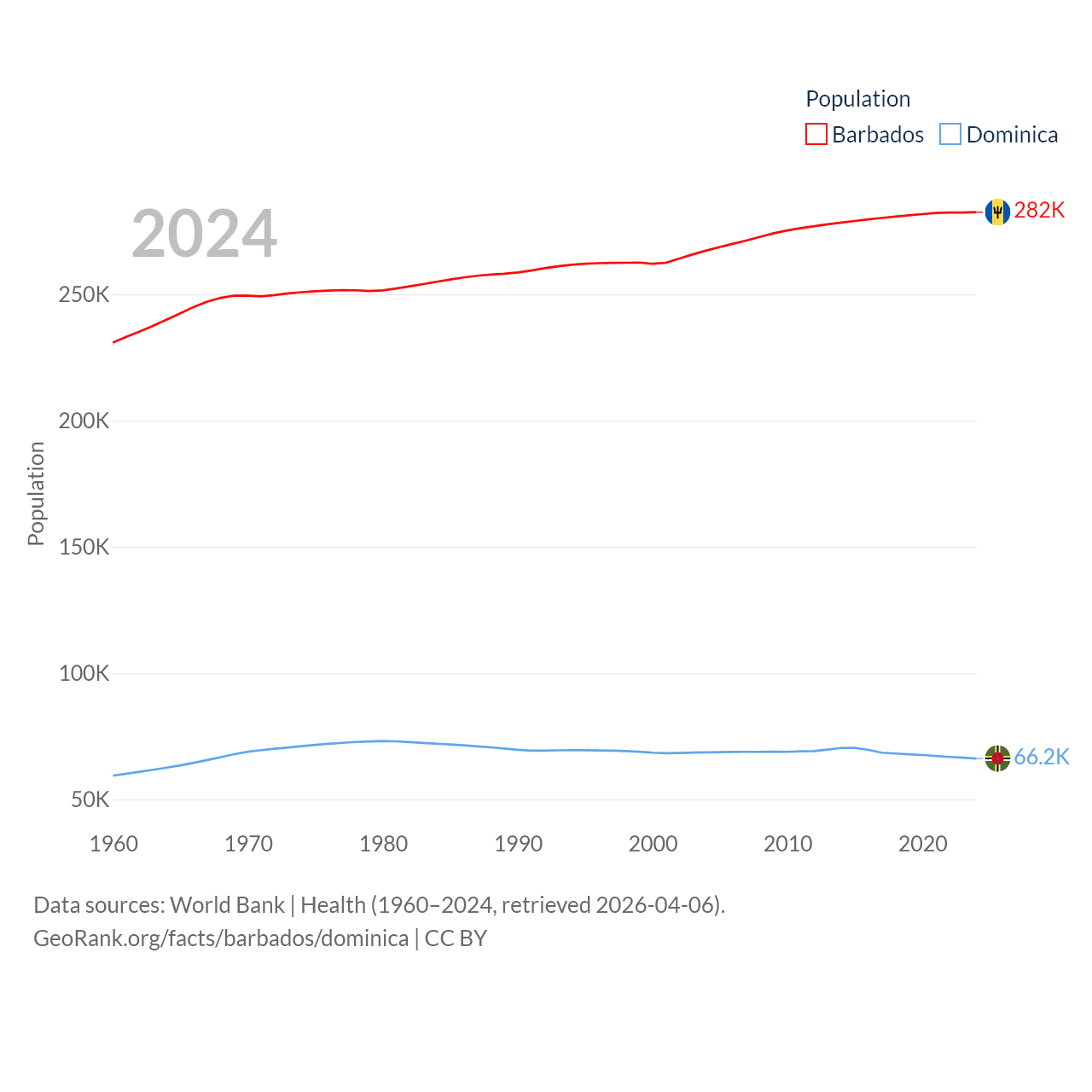 Barbados has a population of 282K (ranked 175/197), compared with 66.2K in Dominica (ranked 188/197). Barbados' land area is 166 sq mi versus 289.6 sq mi for Dominica (ranked 184th vs. 175th).