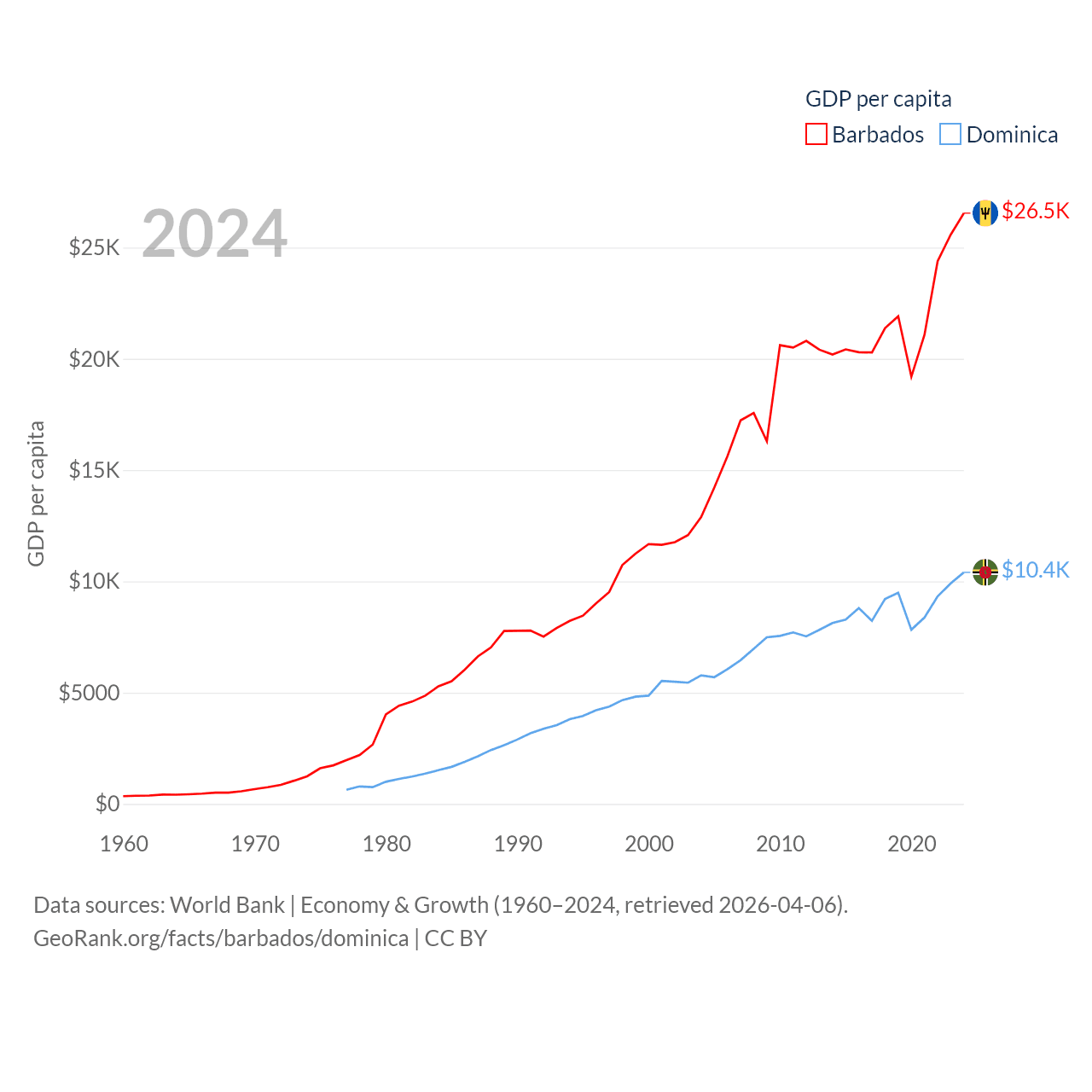 By GDP, Barbados ranks 157/197 ($7.5B) and Dominica ranks 190/197 ($689M). By GDP per capita, Barbados ranks 46/197 ($26,545), while Dominica ranks 84/197 ($10,405).