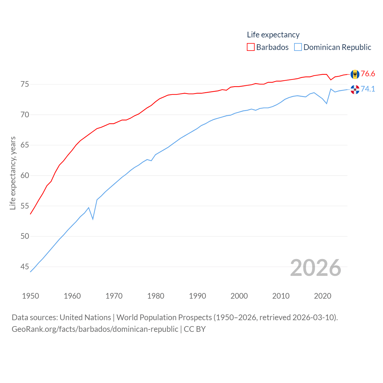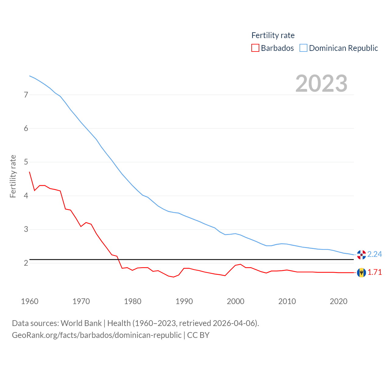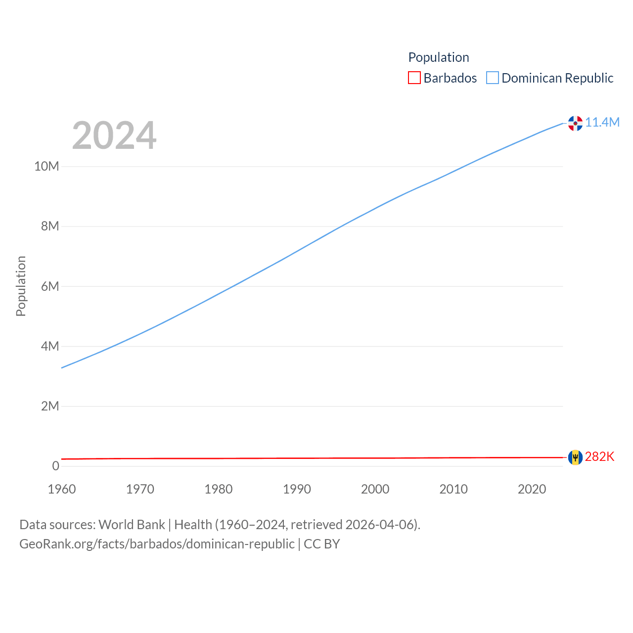 Barbados has a population of 282K (ranked 175/197), compared with 11.4M in The Dominican Republic (ranked 85/197). Barbados' land area is 166 sq mi versus 18,609 sq mi for The Dominican Republic (ranked 184th vs. 127th).