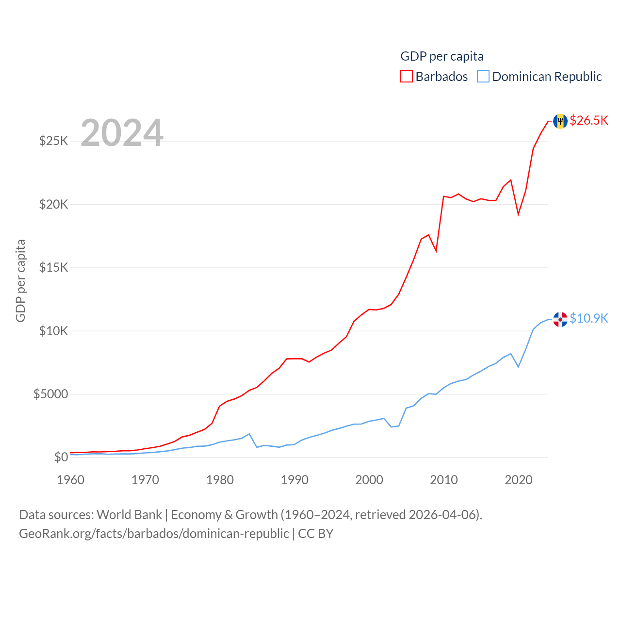 By GDP, Barbados ranks 157/197 ($7.5B) and The Dominican Republic ranks 63/197 ($124B). By GDP per capita, Barbados ranks 46/197 ($26,545), while The Dominican Republic ranks 83/197 ($10,876).