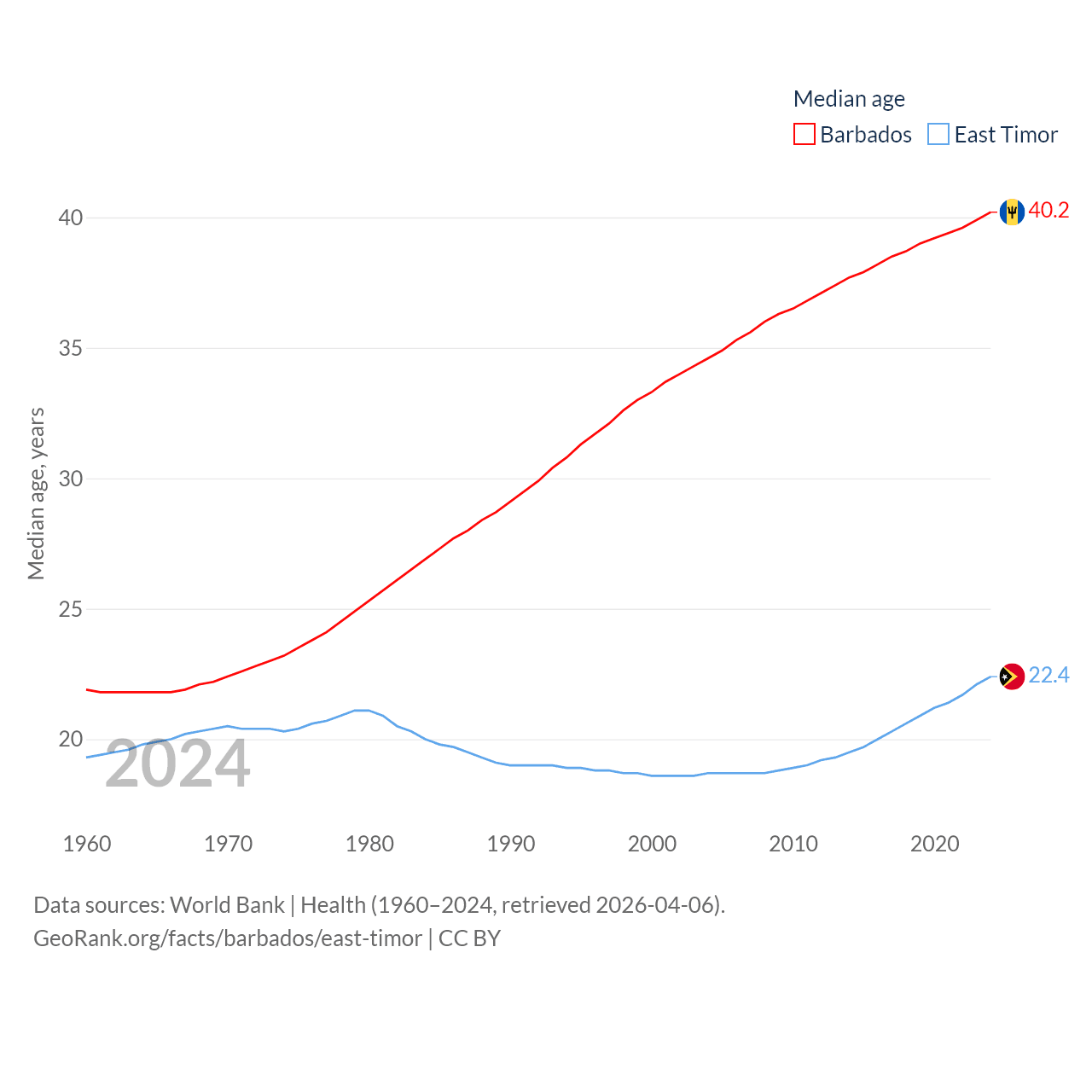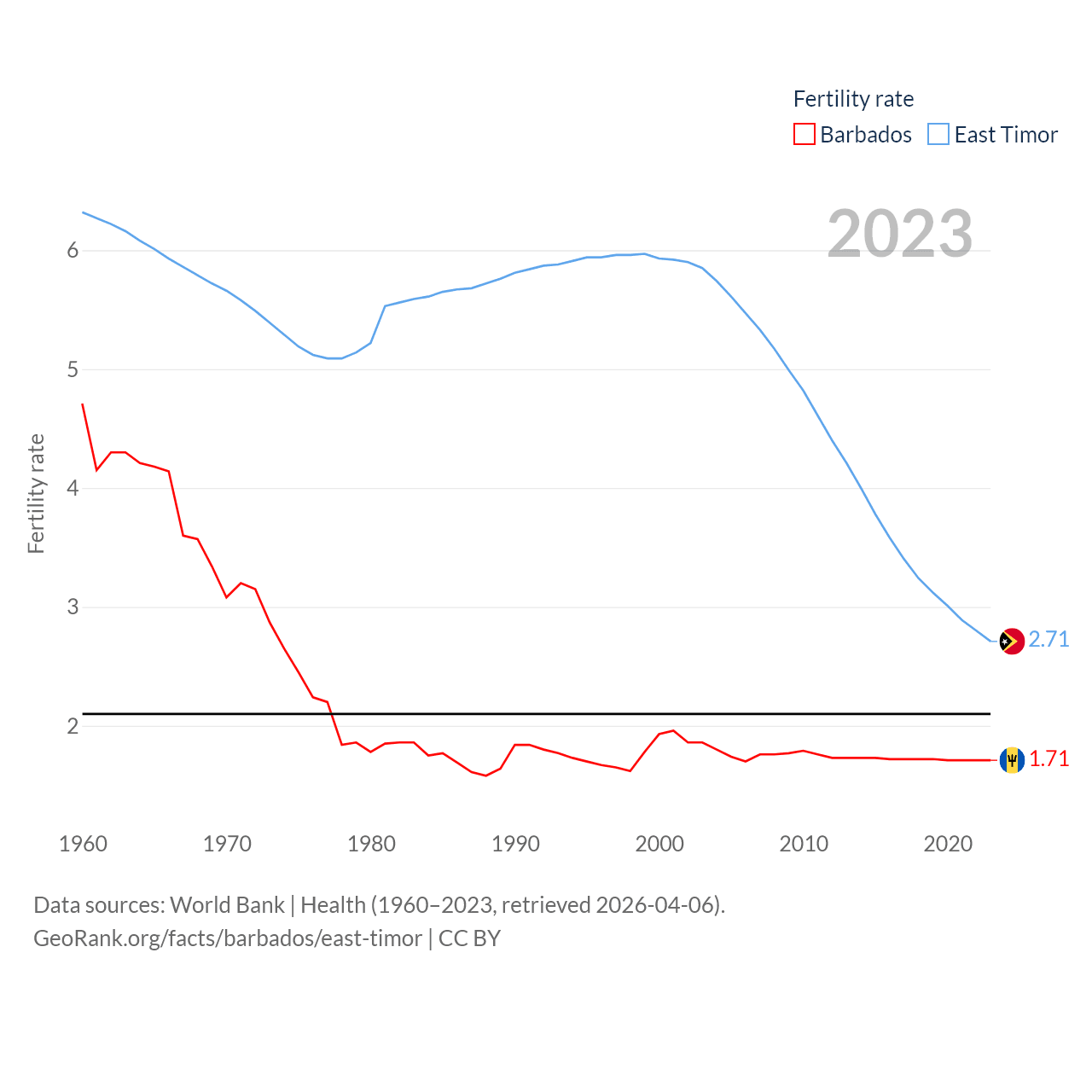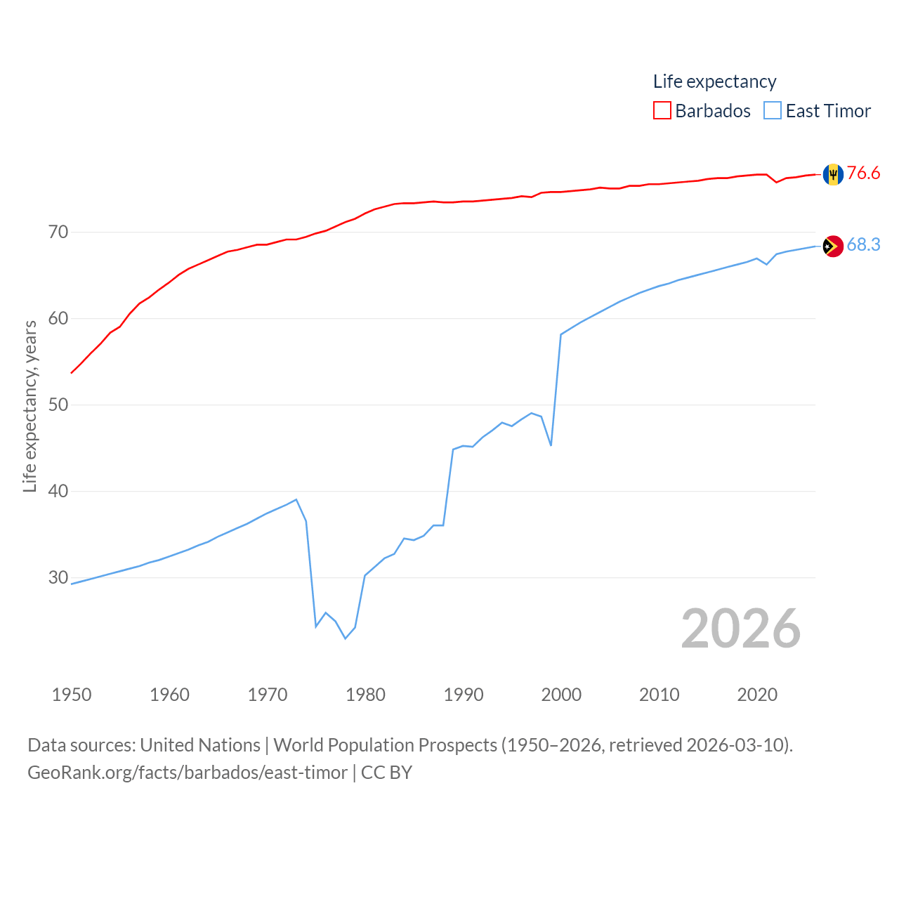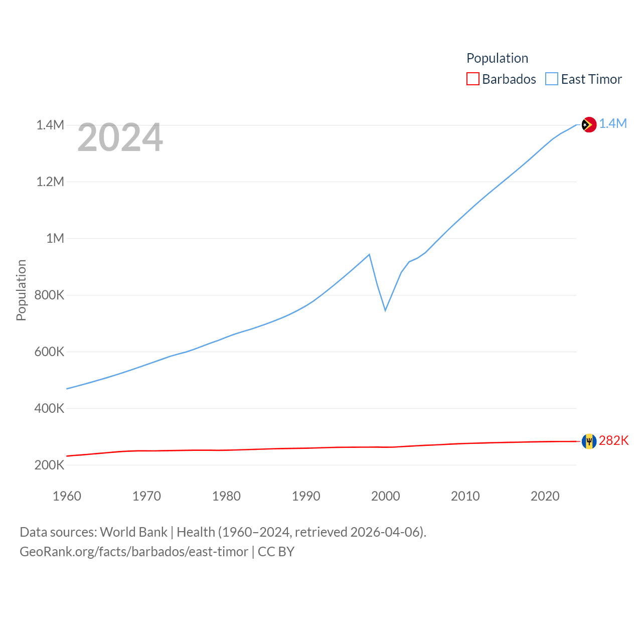 Barbados has a population of 282K (ranked 175/197), compared with 1.4M in East Timor (ranked 152/197). Barbados' land area is 166 sq mi versus 5,741 sq mi for East Timor (ranked 184th vs. 155th).