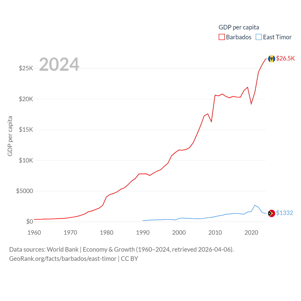 By GDP, Barbados ranks 157/197 ($7.5B) and East Timor ranks 181/197 ($1.87B). By GDP per capita, Barbados ranks 46/197 ($26,545), while East Timor ranks 167/197 ($1,332).