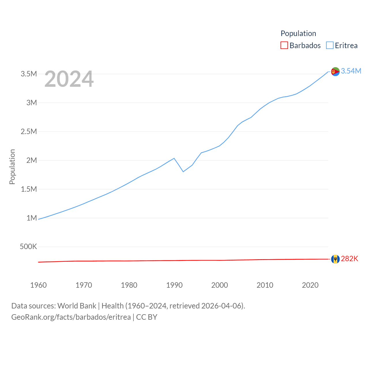 Barbados has a population of 282K (ranked 175/197), compared with 3.54M in Eritrea (ranked 131/197). Barbados' land area is 166 sq mi versus 46,787 sq mi for Eritrea (ranked 184th vs. 96th).