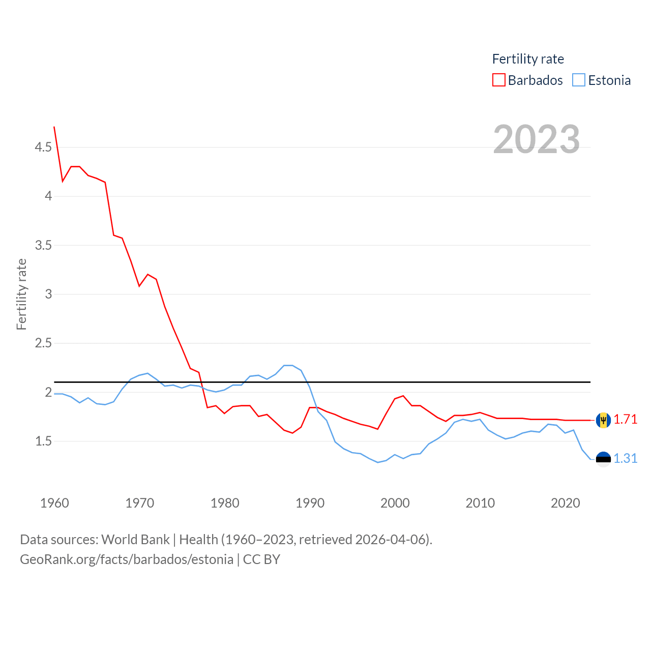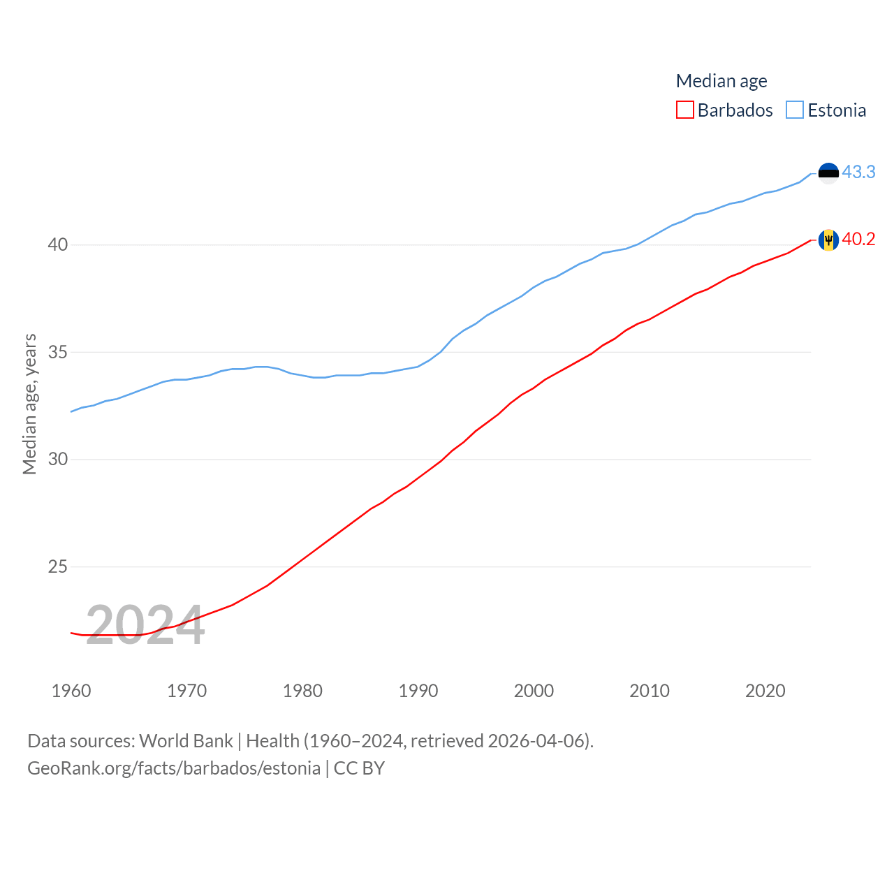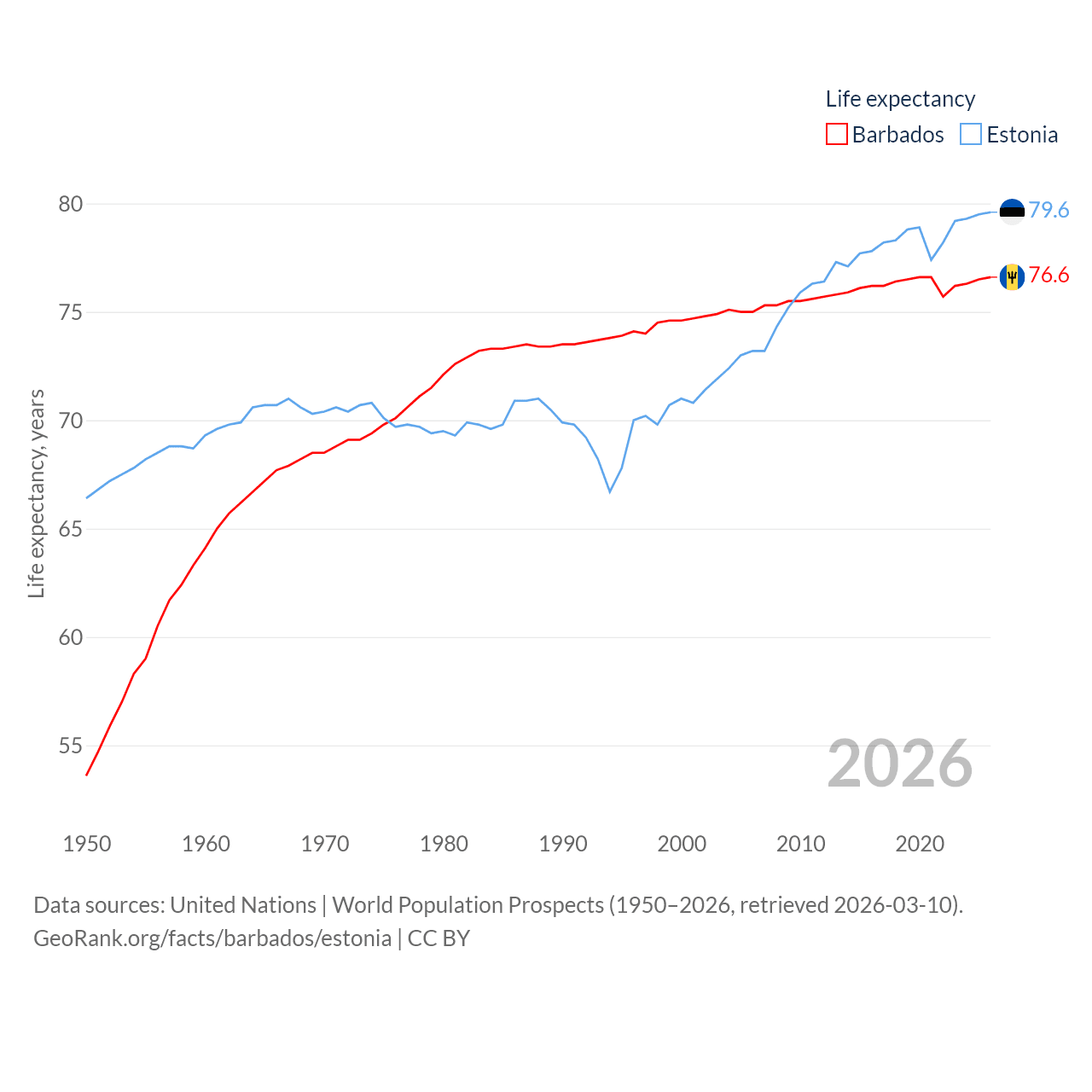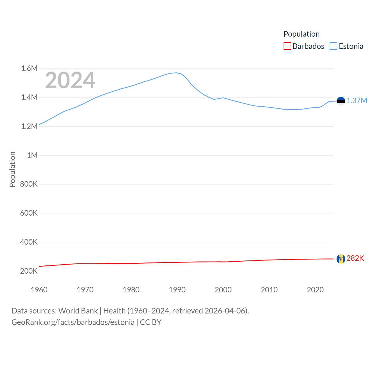 Barbados has a population of 282K (ranked 175/197), compared with 1.37M in Estonia (ranked 153/197). Barbados' land area is 166 sq mi versus 16,498 sq mi for Estonia (ranked 184th vs. 129th).